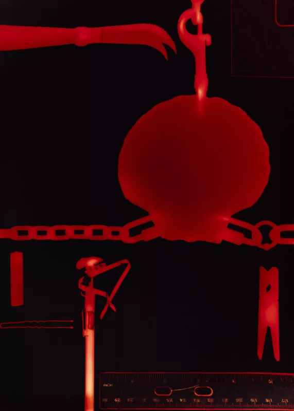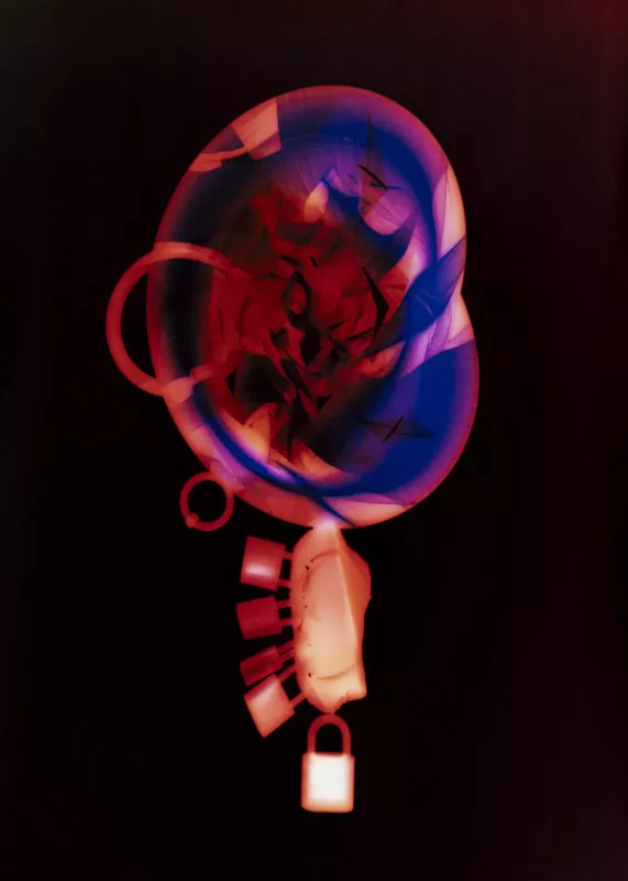 Man Ray’s photograms of the Twenties were a technical study in the materiality of photo paper. I built a basic darkroom in my bathroom with cheap construction material. Along with fashion items, I incorporated found objects from my home, limiting myself to my confinement. The whole process felt very scientific like I was a chemist. This impacted my sense of composition which became more calculated and rigid. I studied how we experience incandescent light through its interaction with objects. A photogram is a recording of the physical nature of light. Although we can’t touch it, it has a direct, chemical response on photo paper.
