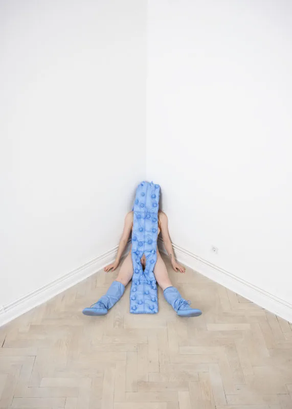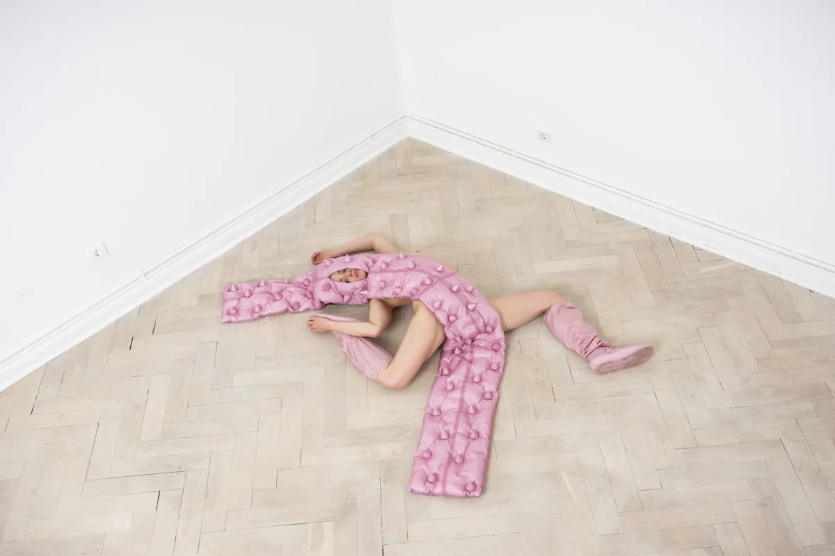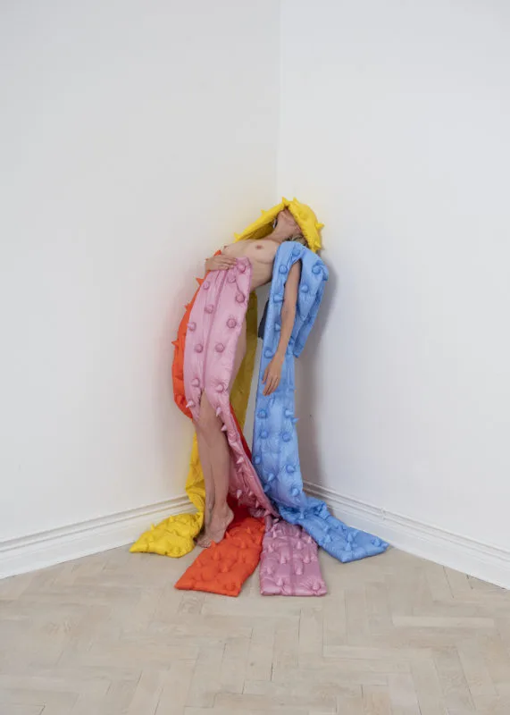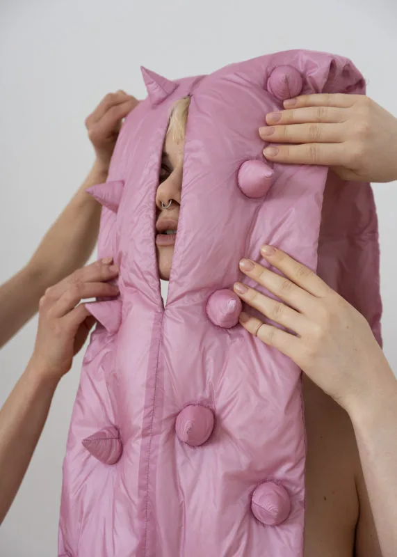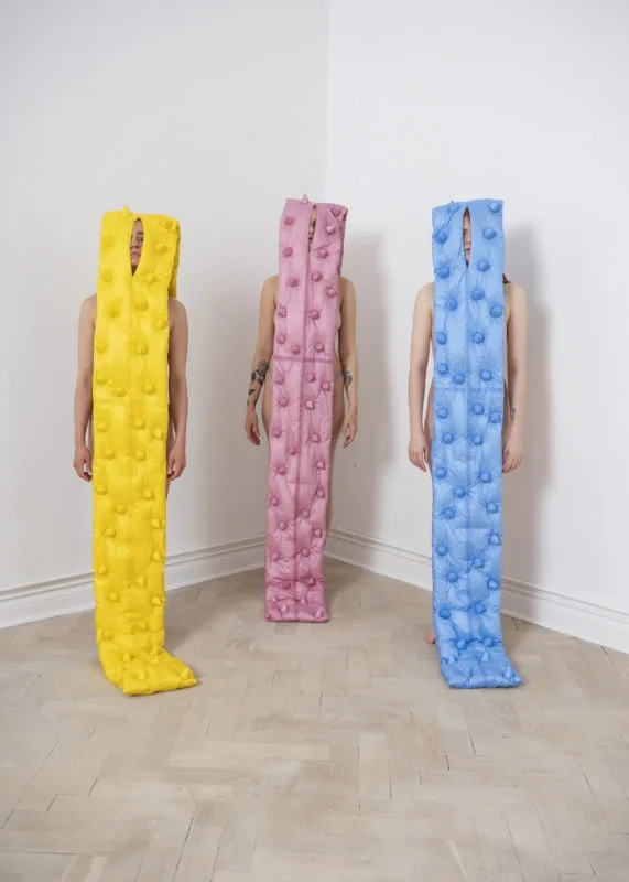 The Dark Side Of The Moon Pink Floyd rainbow design. I wanted to combine the garments with nude bodies using the holes in the scarves as a little window to reveal parts of the wearer.