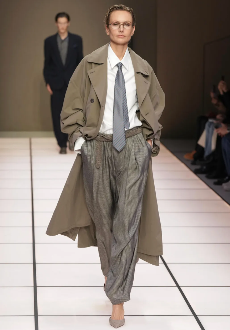 We need to insist on what Milan looks like. The city’s palette is gray, never flat, altered by rain. Armani, today under the direction of Leo Dell’Orco, remains the clearest expression of the Milanese logic