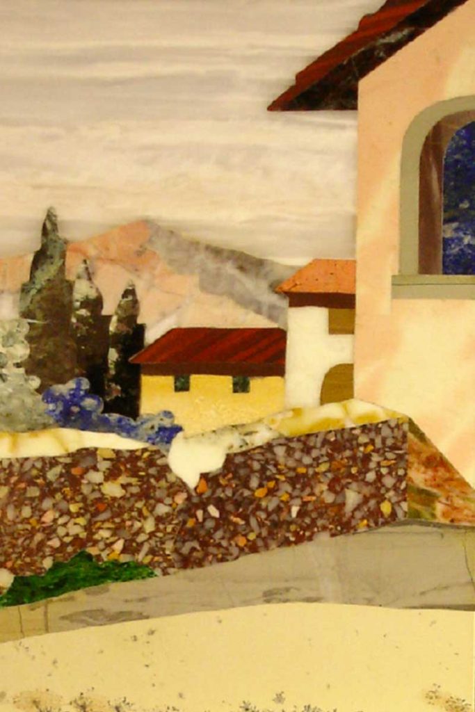 When his son Iacopo was born in 1968, Bruno Lastrucci left Fiaschi and set up on his own, taking his loyal clients with him and becoming the top mosaic maker at Montici, working alongside the other ateliers that already reported to the American – Menegatti, Fracassini and Fiaschi. In 1972, after the death of Rossino Ferdinando degli Innocenti, Lastrucci started to buy out the other workshops. The last one he acquired – in 1976 – was Arte Musiva from the Montelatici brothers, in Piazza Santa Croce. With the death of Richard Blow in 1983, what remained of Montici also became Bruno Lastrucci’s. For a while, Bruno moved into the premises of the former Arte Musiva space in Santa Croce, but he found it too small and the crowds of tourists interfered with the privacy that many of his clients sought. By 2002, Lastrucci moved his workshop to Via dei Macci, 9, where it remains to this day, in what was once a 14th-century hospital with an adjacent convent and church, later becoming a shelter for “unhappily-married women”. Anyone can walk in nowadays, but its position off the beaten track means that most who visit aren’t tourists passing by, but rather true connoisseurs. At the entrance, visitors find the laboratory with five workstations, each with an artisan at work. Shelves are filled with slices of stones, mosaics at various stages of production, sketches, files and wooden drills of all kinds. In the backroom is a display of their artistic and artisan labors: not only those produced by Lastrucci, but also those by the workshops and companies he’s purchased – a museum laboratory of contemporary Commesso Fiorentino mosaics.