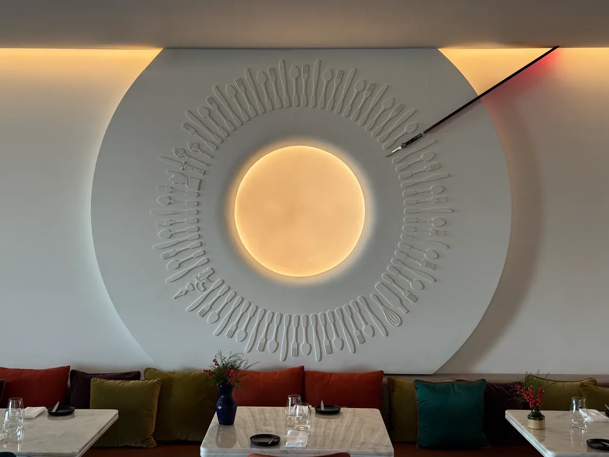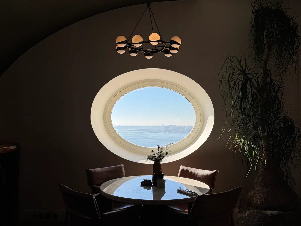 Much of the crockery is made by small Portuguese ceramic studios, whose pieces bring subtle irregularities and a tactile, handmade presence to the table. The large oval window frames the river almost like a proscenium, while the open kitchen keeps the energy of cooking visible, connecting guests directly to the process behind each dish.