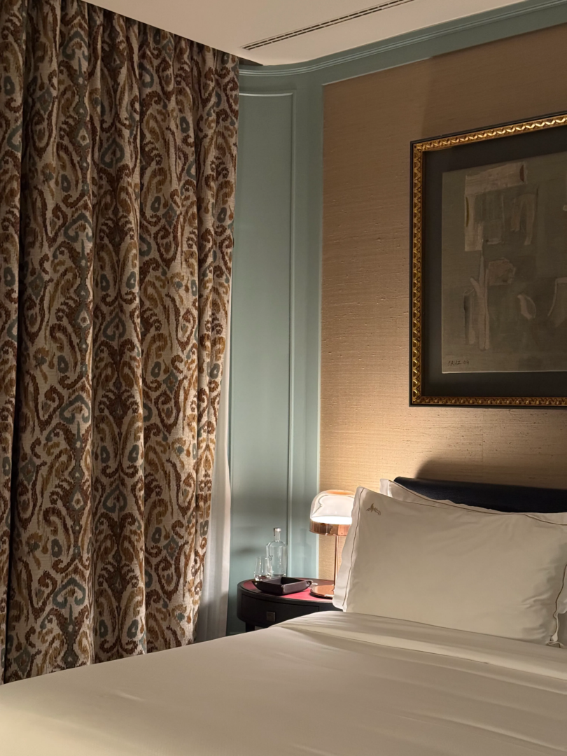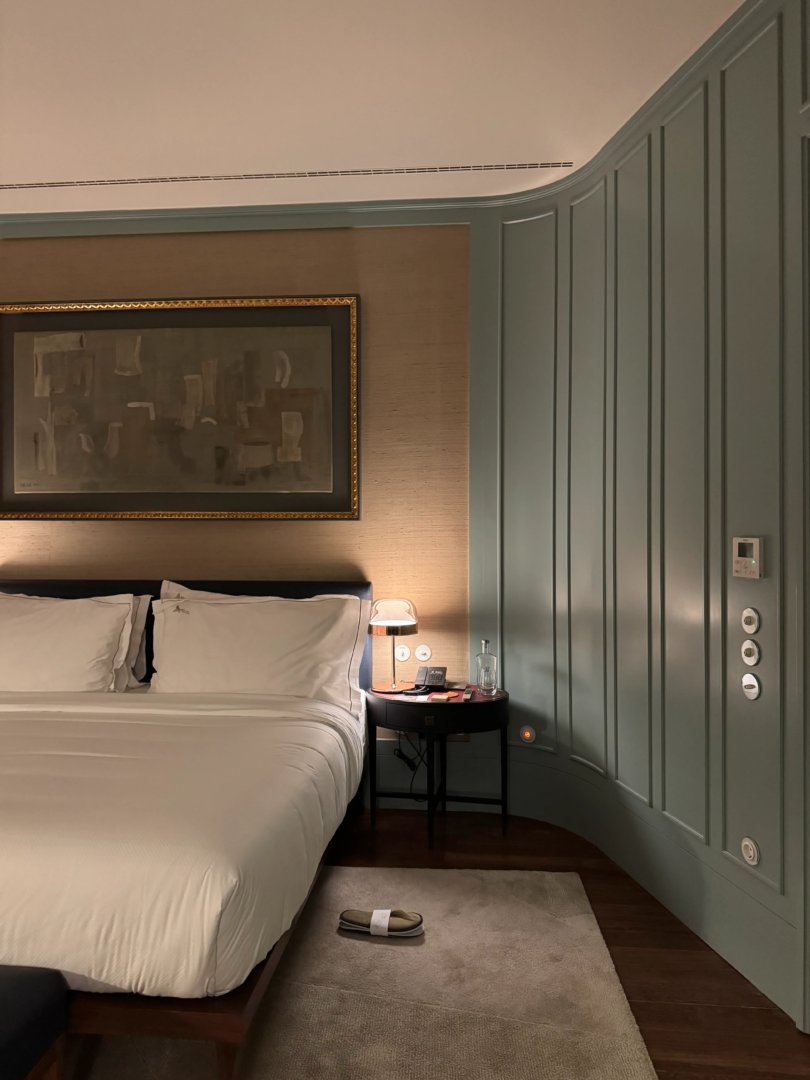 The hotel’s 87 rooms – 22 of them suites – are conceived less as standardized units and more as a family of spaces shaped by the existing buildings and by Lisbon’s light. Instead of forcing every room into identical proportions, the project embraces variation: ceiling heights change, wall lines are sometimes angled, windows open onto different kinds of urban scenes. This diversity becomes the starting point for the interior design.