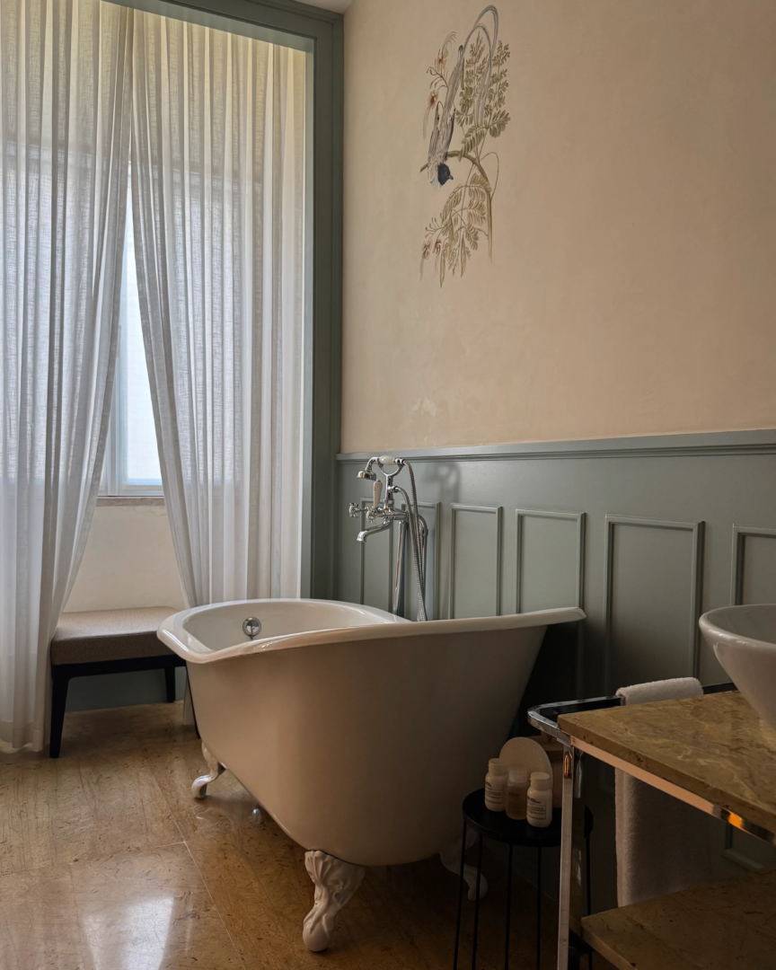One of the defining features of the Chiado Suite is the bathroom. It receives natural daylight and includes both a walk–in shower and an antique bathtub, giving guests a choice between a quick, efficient routine and a slower, more indulgent bath. Surfaces are in stone and marble, fittings are modern but unobtrusive, and the whole room is designed to feel like an extension of the living area rather than a purely functional annex. Le Labo bath products, soft robes and careful lighting complete the impression of a private sanctuary that still feels connected to the day outside.