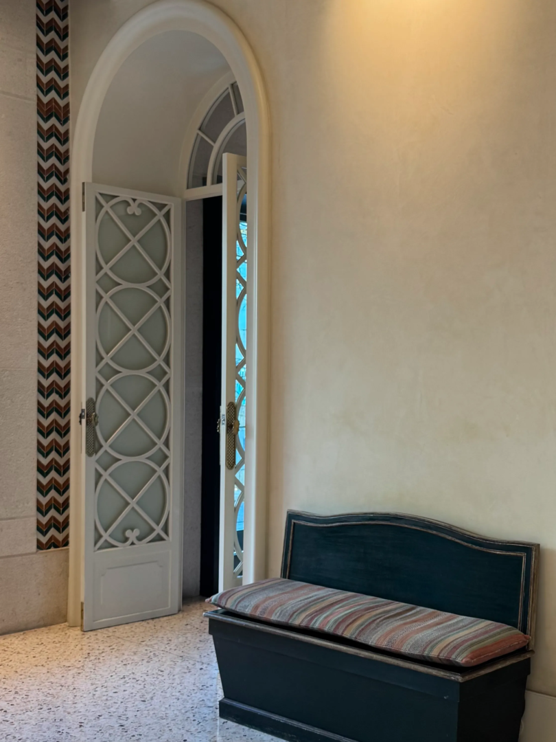 Furniture is largely custom–designed, with clean lines and an understated mid–century inflection. Built–in wardrobes, consoles and headboards are crafted in wood, sometimes combined with cane or fabric panels. Freestanding pieces – armchairs, side tables, desks – come from a mix of contemporary Portuguese makers and carefully selected vintage items. Textiles are produced by local artisans: woven rugs, throws, curtains and upholstery add texture without overwhelming the rooms.