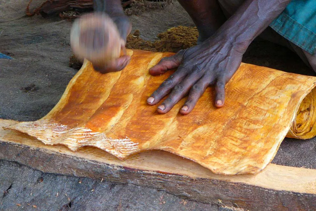 The tree is then rubbed and then covered with banana leaves in order to protect it and allow the bark to regrow in nine months; by implementing this conservative method it is possible to keep the trees alive for about forty years. To make it malleable, the material is simmered over solar stoves for twenty minutes and then beaten manually with specially constructed wooden hammers to make it uniform. Then the material is placed in the sun to dry and this process of boiling, beating and drying is repeated until the desired strength is achieved.
