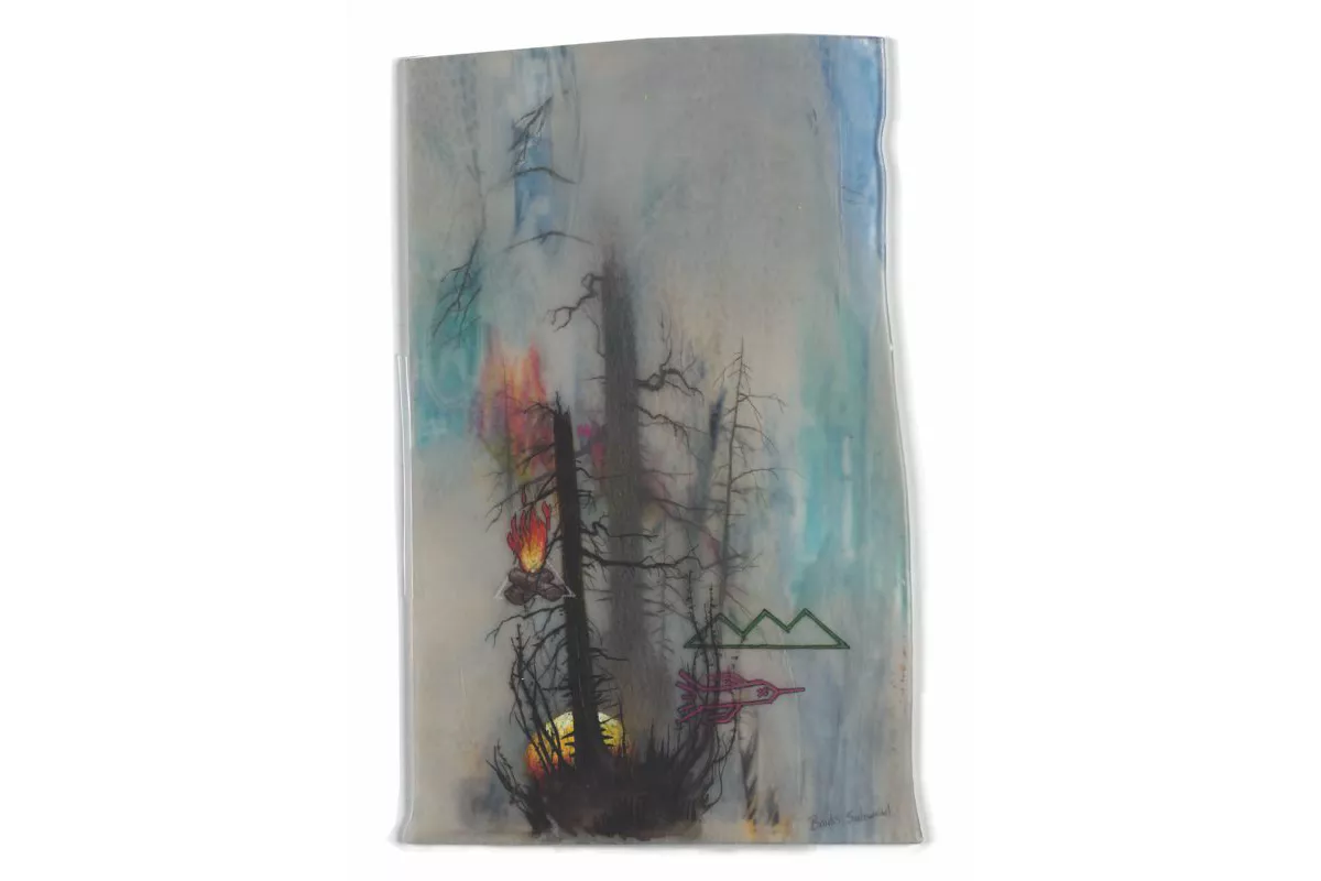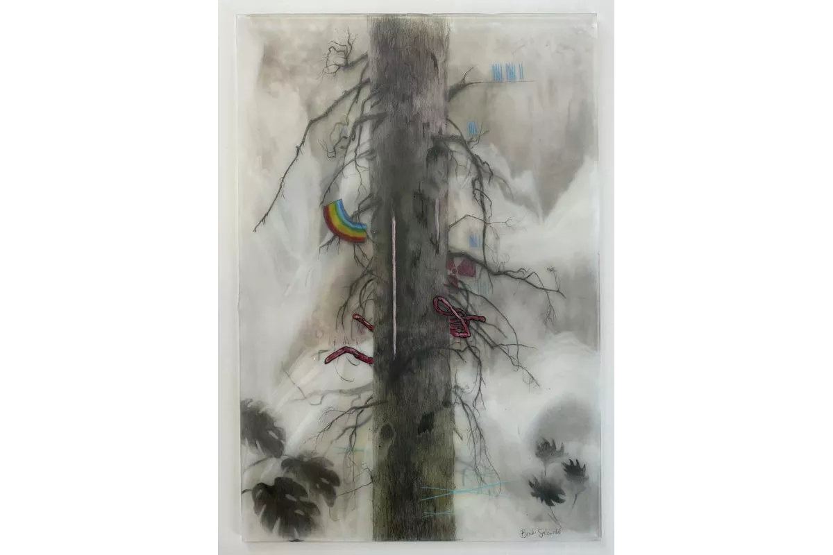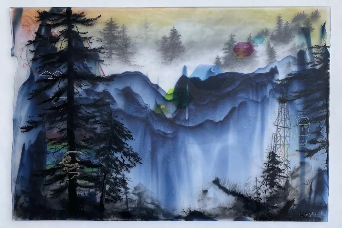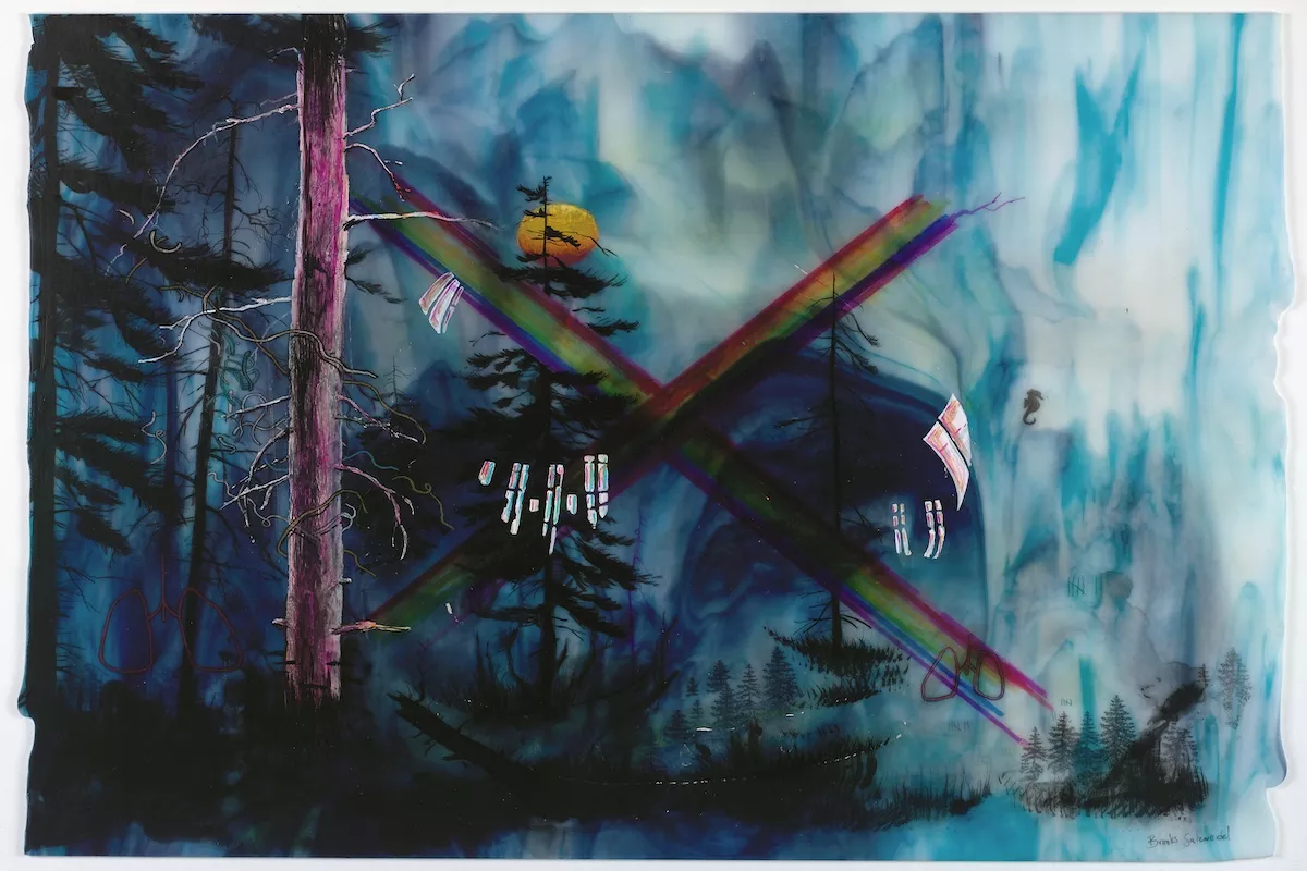 Brooks Shane Salzwedel’s lands – captured within his landscapes, often engaged in various stages of contemplation and transformation – are fueled with the paradoxical energies of the possible and the imagined. The works show the rules of nature with a bit of chaos, creating unlikely scenarios. One will find oil rigs, fire pits, pills, rainbows, logos, viruses, planes and other curios creating a narrative when pieced together. Salzwedel is using his inner strength and inner child to tell his story: a self-created process involving materials such as graphite, waterproof inks, colored pencil, pen, acrylic, tape, spray paint, collage and glass gives an even further feeling of depth. Reimagining a new life for the objects, he often uses Bullseye Glass – recyclable glass and sometimes parts of broken glass that would have been disposed of. His work often focuses on natural and unnatural landscapes, disconnected from their usual surroundings or places in time. «I want to evoke feelings of desolation through these terrains». Ancient trees, decaying flora, and icy mountains obscure long forgotten places and objects, at once familiar and unrecognizable, creating a space for rumination that challenges the relationship to their meaning.