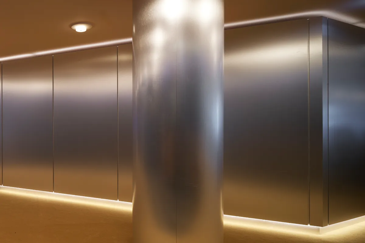 The exterior envelope is metallic and reflective. The interior spaces, by contrast, are defined by timber finishes and warm materials, establishing a calibrated dialogue between industrial technology and alpine domesticity.