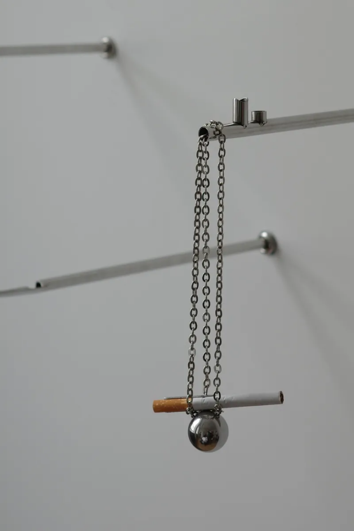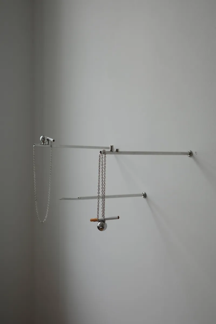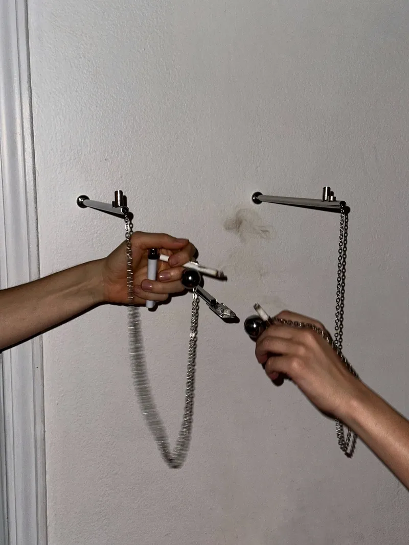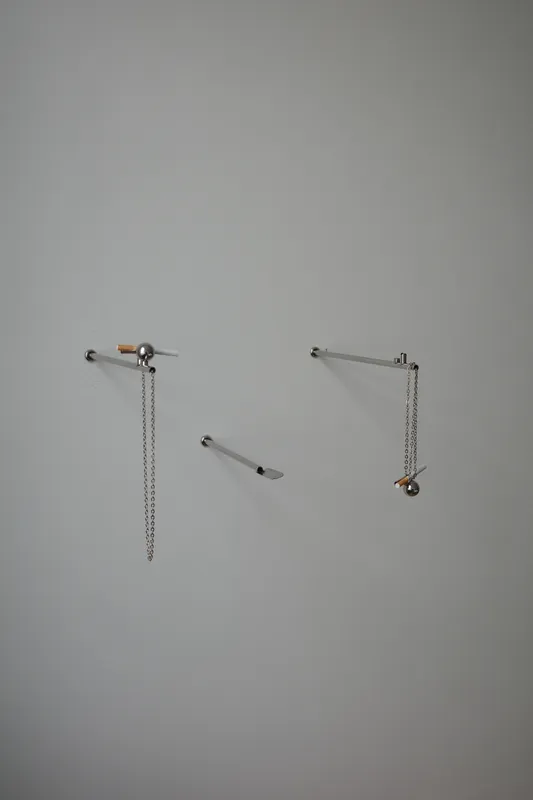 Chisme Corner is a wall installation by Ananas Ananas composed of stainless-steel cigarette holders fixed to a horizontal bar, each attached by a short chain, with a shallow tray placed below. The work does not announce itself as a social device; it establishes a small arrangement of objects around which behaviour gathers for a pause. When the pause ends, the holder is returned to its place, and the wall resumes its neutral state. Nothing is retained beyond the moment of use.