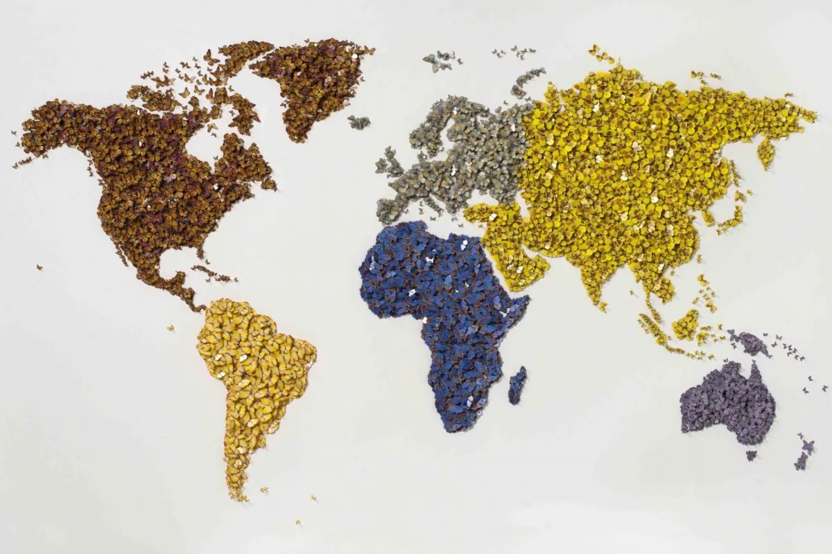 To return to the butterflies: Gambino’s installations are composed of paper forms, cut by hand and assembled into clusters that trace geographic shapes. These configurations resemble maps — familiar in their outlines, unsettling in their instability. The butterfly, traditionally associated with transformation and ephemerality, becomes here a unit of measure for territories that are provisional rather than fixed. Borders drawn in paper and pins do not hold. They suggest that geography, like memory, is always on the verge of dispersal.