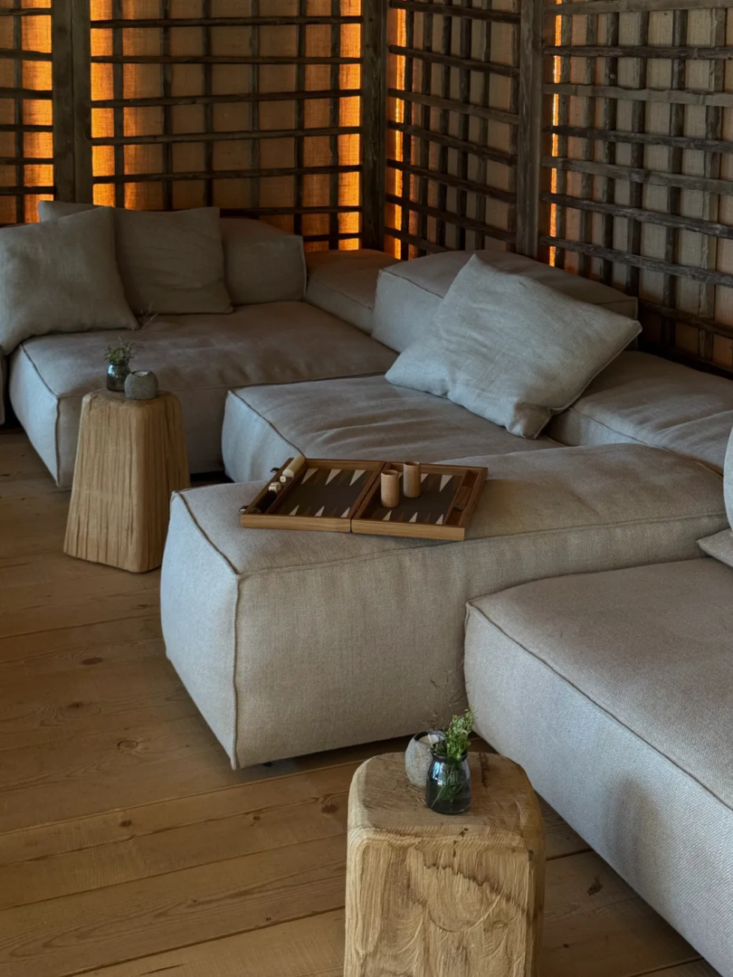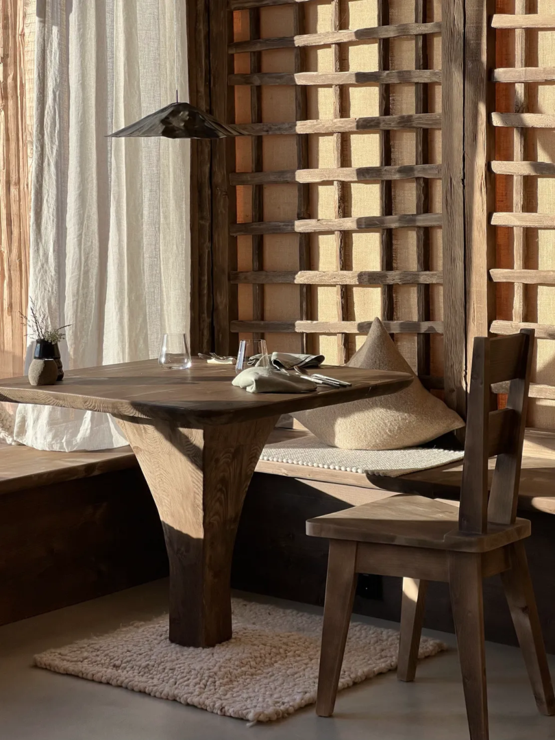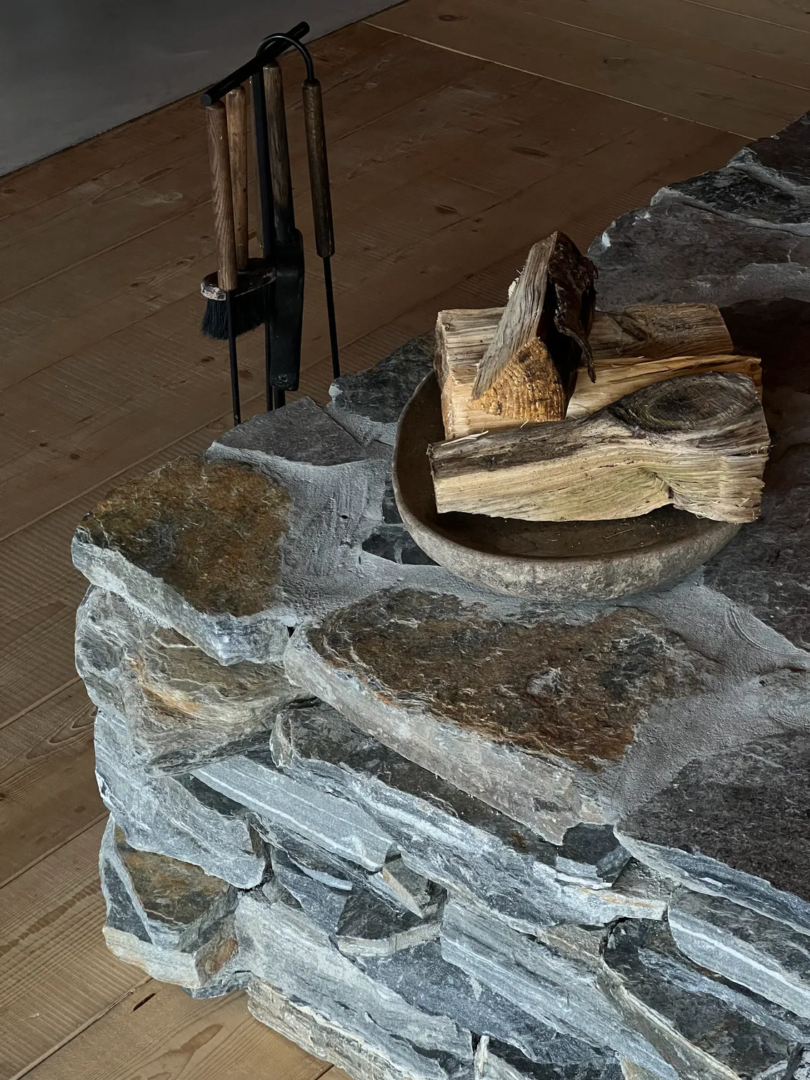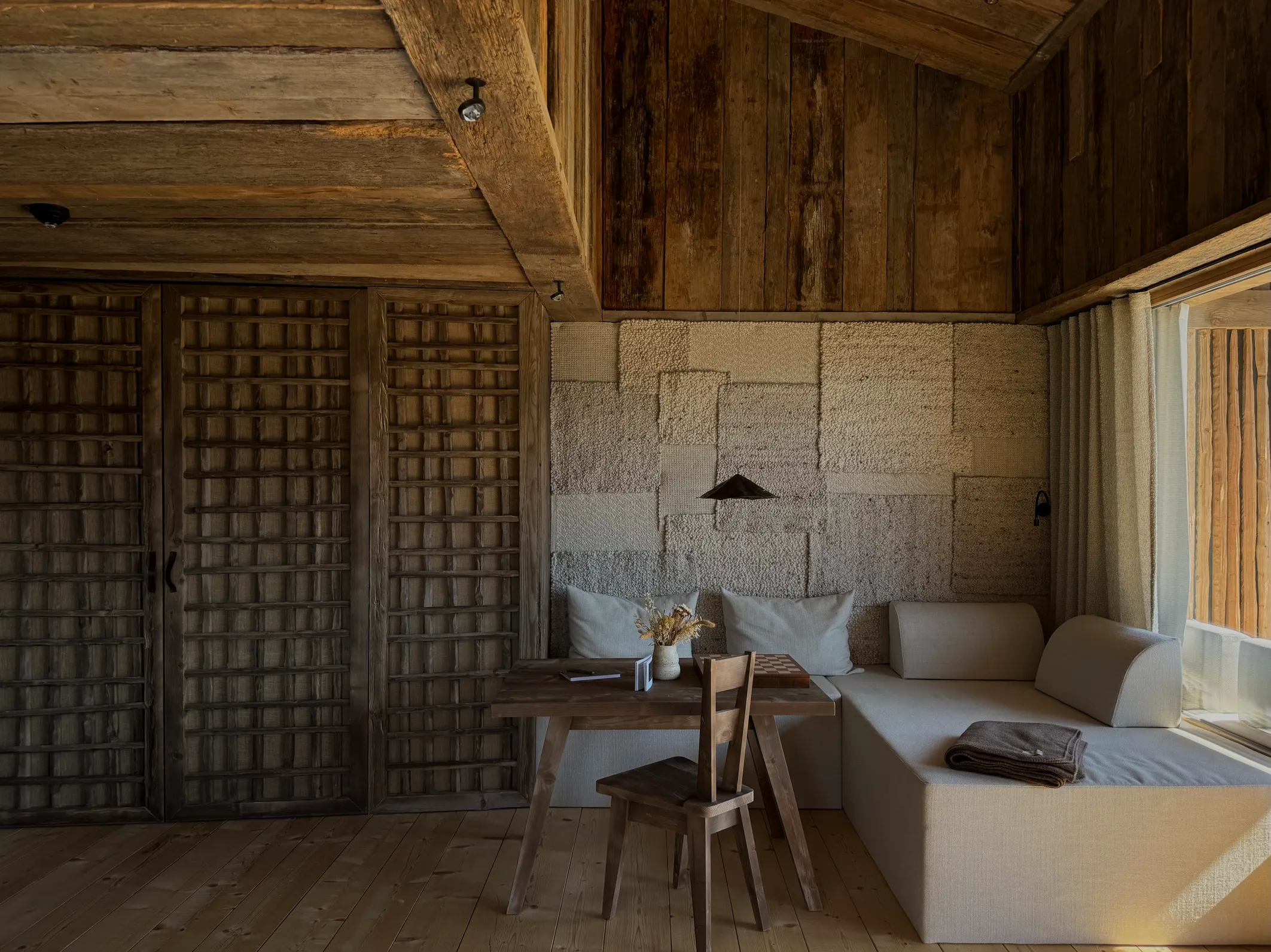 Inside, the retreat continues this logic of tactile coherence. Floors are solid wood. Walls are insulated with sheep’s wool washed by hand, sourced from flocks that graze the slopes around Eriro each summer. The wool moderates humidity, absorbs sound and stabilizes temperatures, so that comfort comes as much from the construction as from the heating system. Linen fabrics lend a dry, durable hand to bedcovers and upholstery. In some places, local stone adds thermal mass and a feeling of anchoring in the ground beneath the buildings.