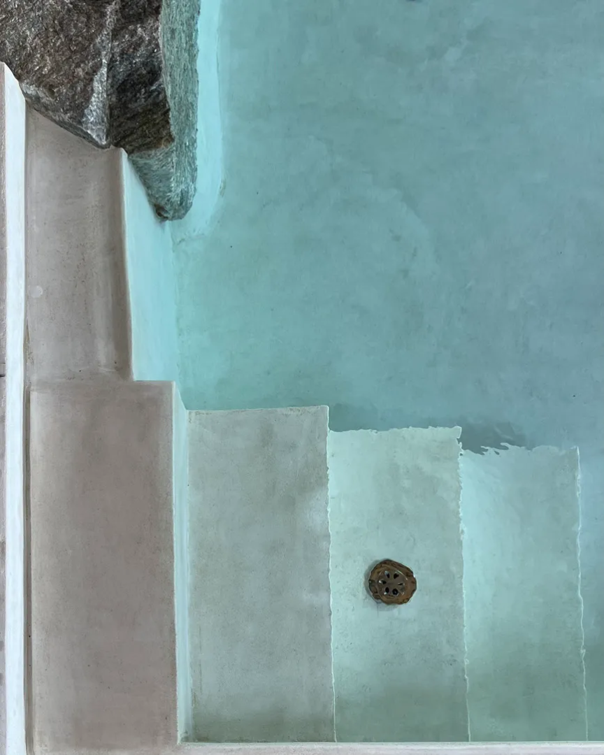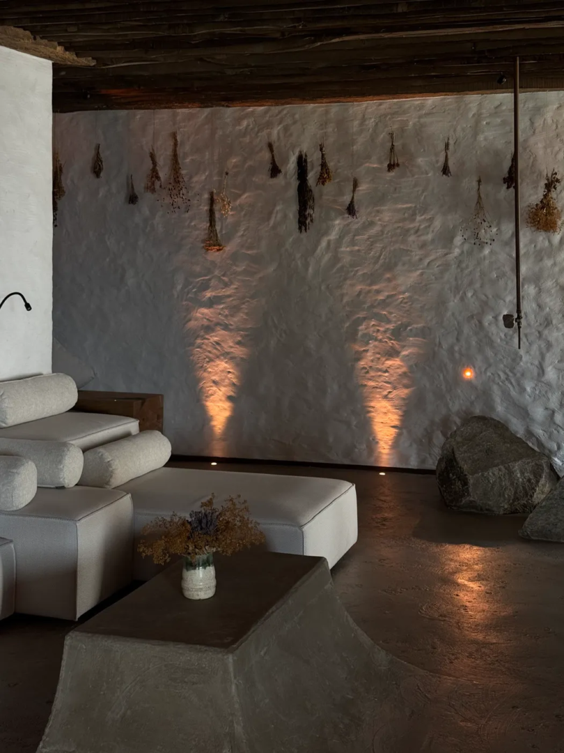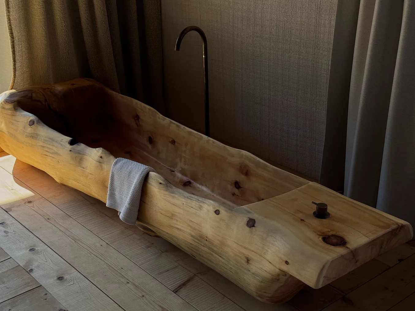 High above the valley, water becomes a protagonist. A private mountain spring lies just above Eriro, feeding the retreat through a short, direct system. The water is collected, mechanically filtered and brought to taps and showers without chemical treatment or long-distance travel. Guests drink what the mountain offers almost at the point where it surfaces. Bottled water loses its appeal when the glass in your hand holds something this immediate.