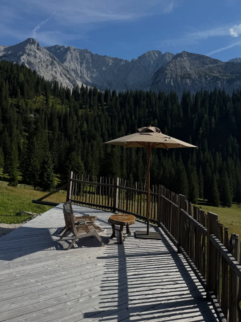 To one side lies Holzerwies, a sunlit clearing under the Wetterstein. The path reaches it almost shyly, threading through the forest before the trees fall away. In summer, the meadow buzzes with insects, and the noise of the world is reduced to wind and the distant clinking of animal bells. Locals use Holzerwies as a place to linger between chores and hikes, to sit down, stretch out and do very little.