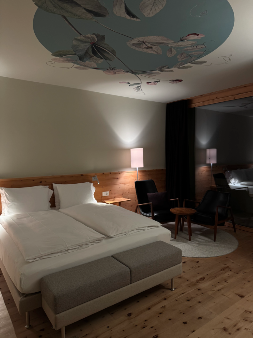 Each guestroom includes a Stüvetta, a miniature retreat within the room—part reading nook, part hideaway cabin—enclosed entirely in pine. Above the beds, softly lit ceilings carry hand-applied floral motifs, reinterpretations of historic Engadin ceiling paintings. These touches complicate the minimalism: they introduce quiet narrative moments, lingering traces of local tradition re-coded for the present.