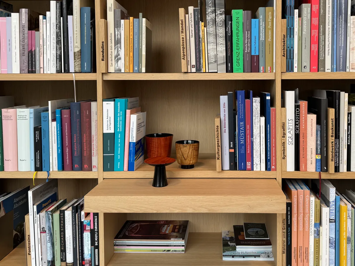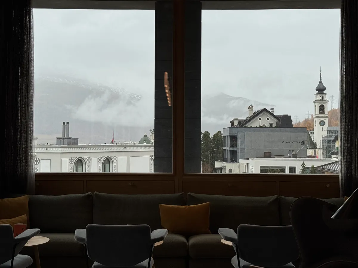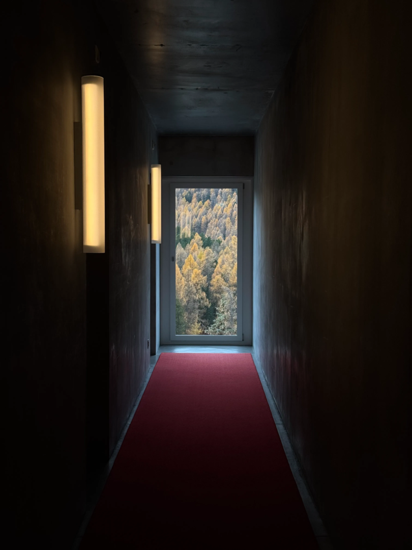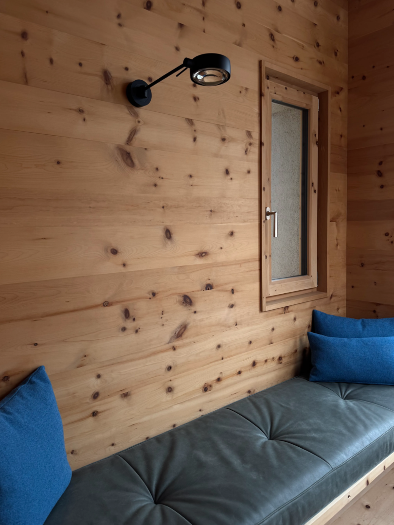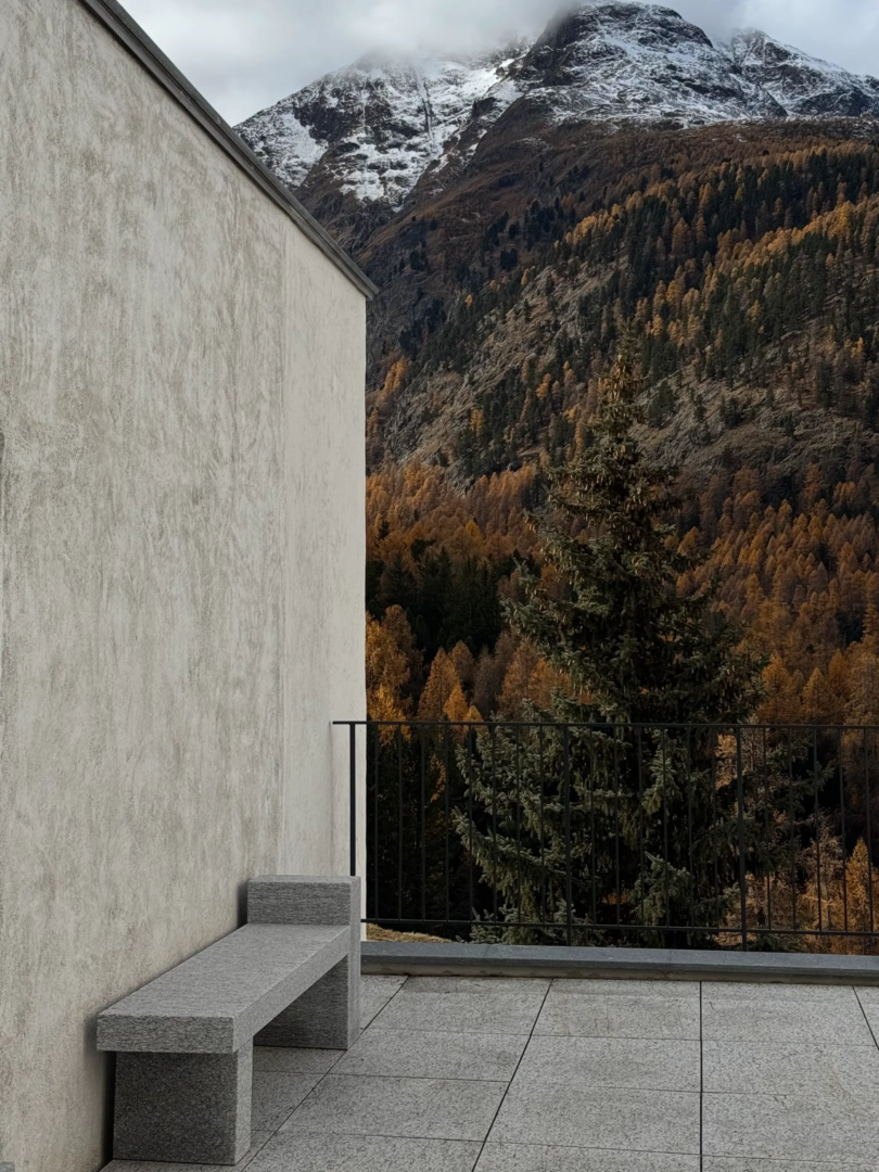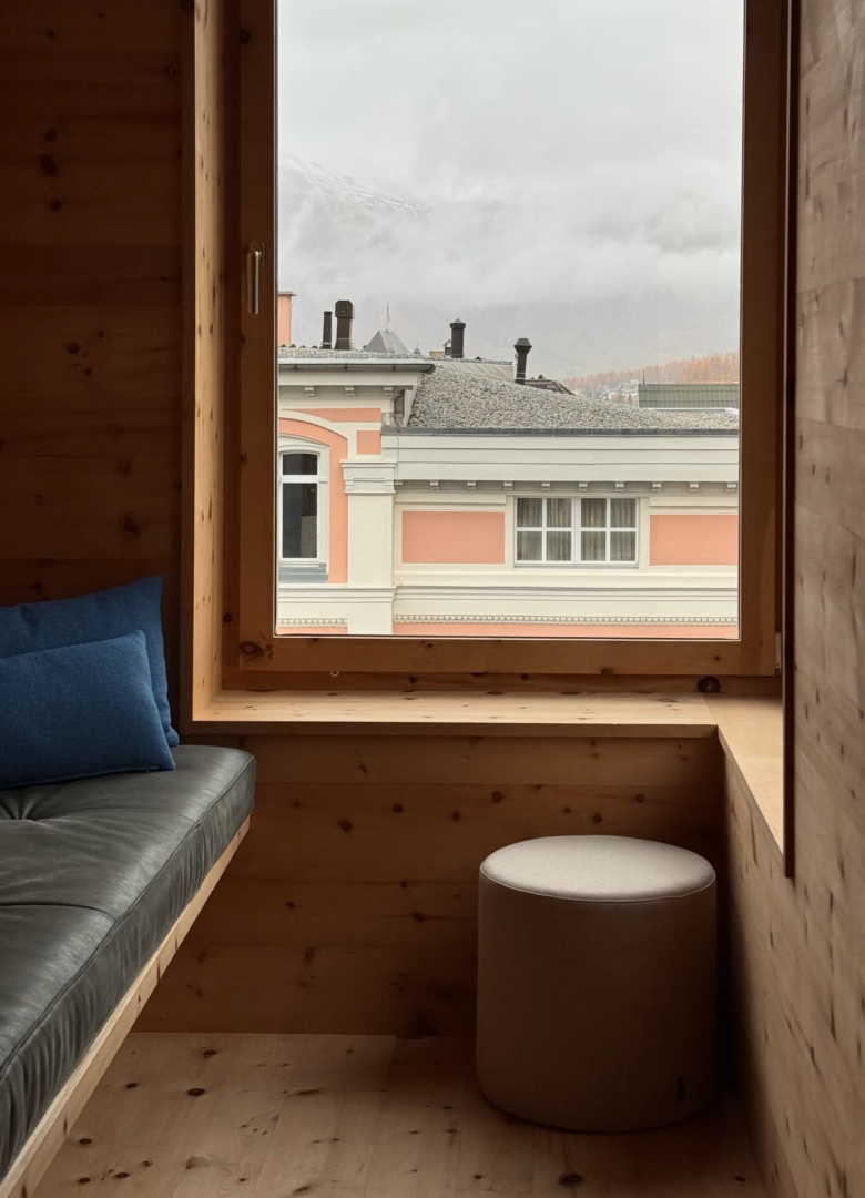 Colour expert Lucrezia Zanetti developed the interior palette by grinding local rocks into pigment, letting the Engadin’s geology determine the hues of the walls. The effect is subliminal but powerful: the interior feels like a chromatic echo of the landscape.