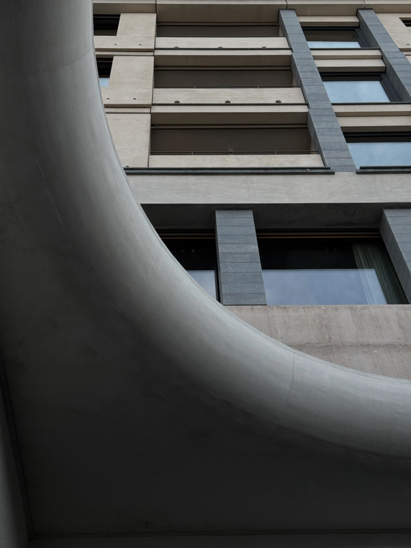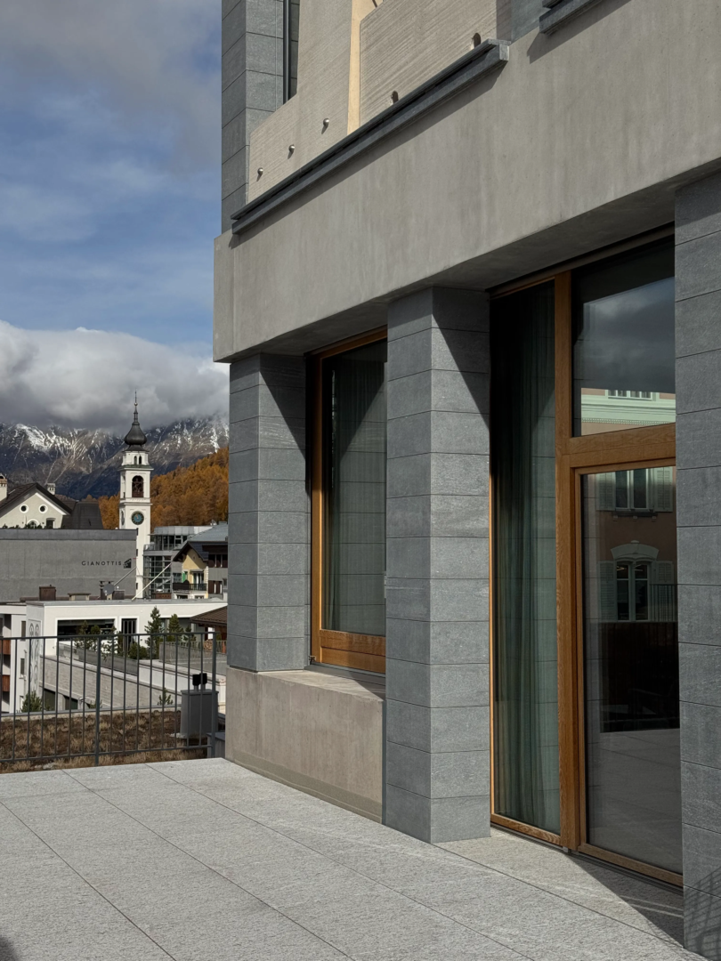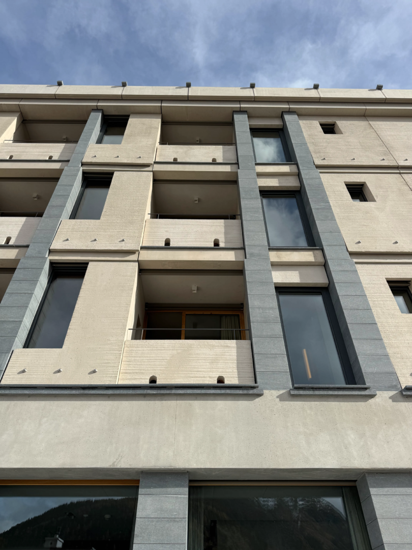 Pontresina’s visual language is steeped in ornament. Painted facades, decorated sgraffiti, carved balconies—hotels often wear their history on their exterior. Maistra 160 does the opposite. Its name is literal, almost administrative; its façade is disciplined, gridded, composed of deep loggias and vertical fins of local stone. The effect is both contrasting and anchoring: the building breaks with the decorative tradition while remaining unmistakably tied to its site.