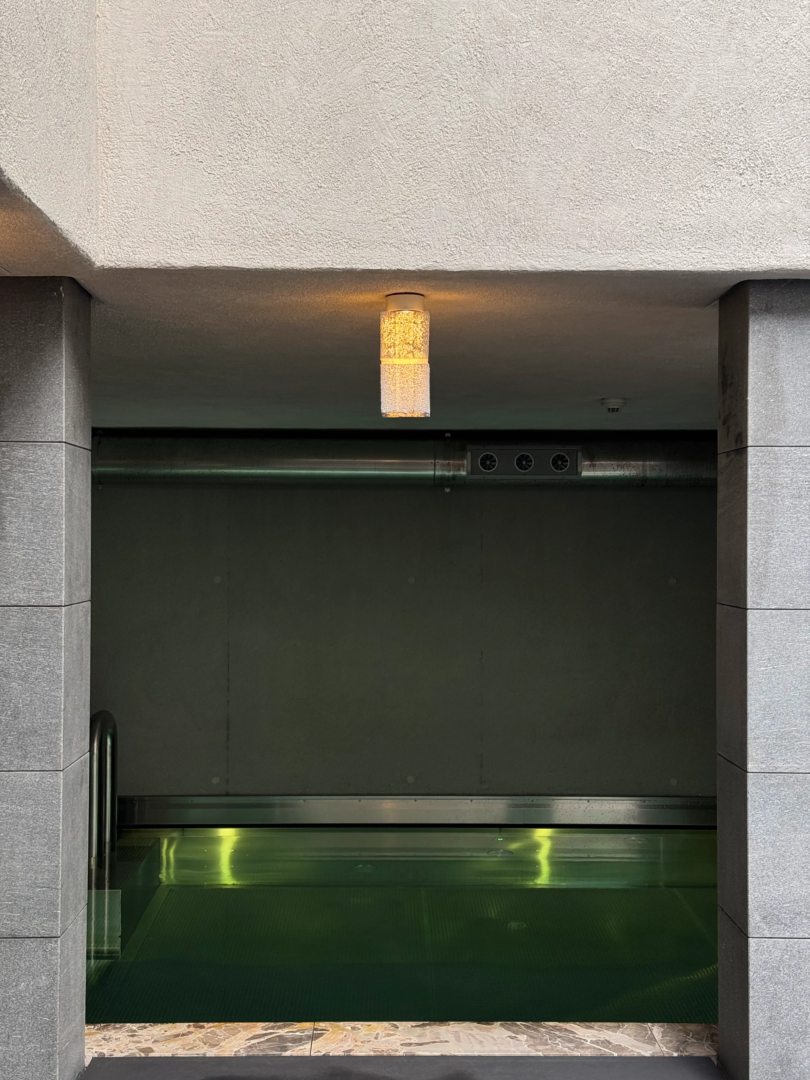 The journey through the spa alternates between compression and release. Narrow corridors in dark gneiss open suddenly into a double-height atrium lined in warm pink marble, with a fire at its core. From there, doors lead to saunas, lounges and treatment rooms, all stripped of decorative excess. The impression is cinematic, almost futuristic: a vision of a civilisation that has learned to merge nature, stone and minimalism with an advanced sense of calm.