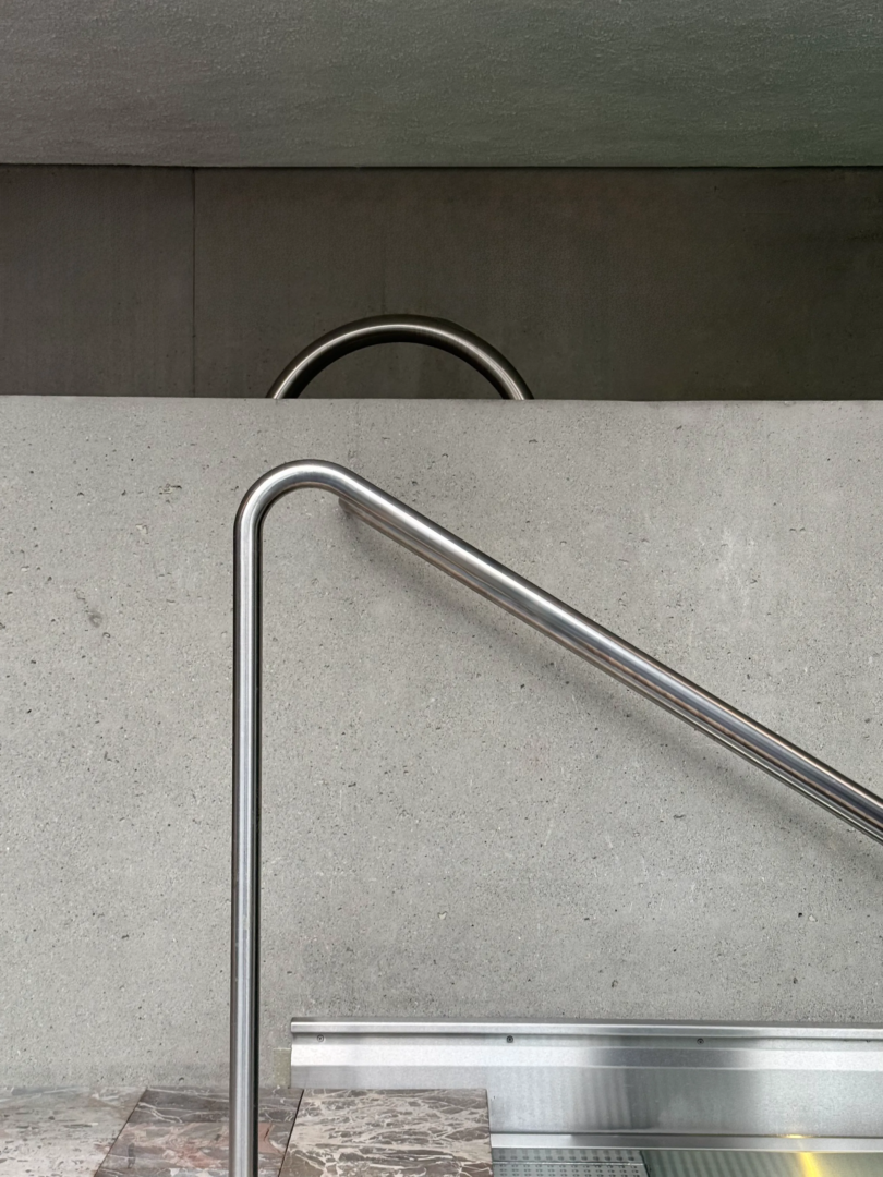 The façade and many structural elements are clad in Bodio Nero gneiss, a dark grey stone quarried in Ticino. Used as vertical pilasters and deep façade elements, it anchors the building visually to the surrounding geology. Inside, the mineral story continues: floors in hand-poured terrazzo—a process that unfolded over several months—embed fragments of jade from Valposchiavo, creating minute green sparks in an otherwise quiet surface.