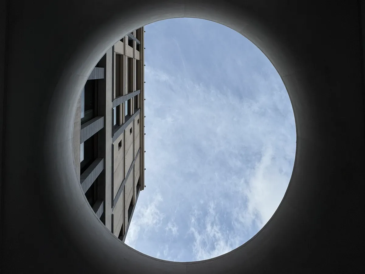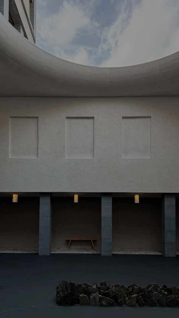 At the centre of the courtyard, a sculptural stone presence rises like a geological marker—an object that feels both ancient and intentional, reminding visitors of origins and trajectories.
