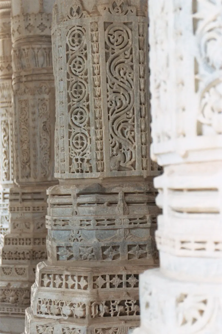 Udaipur’s limestone inlays shimmer like distorted prisms. Craftsmen place fragments of curved glass onto a sketched pattern, pour liquid lime over them, then reveal the design once the slab is flipped: a glimmering stencil that alters reality through its convex reflections. The oldest pieces show denser lime and deeper-set glass — motifs of the tree of life, flowered vases, cascading leaves.