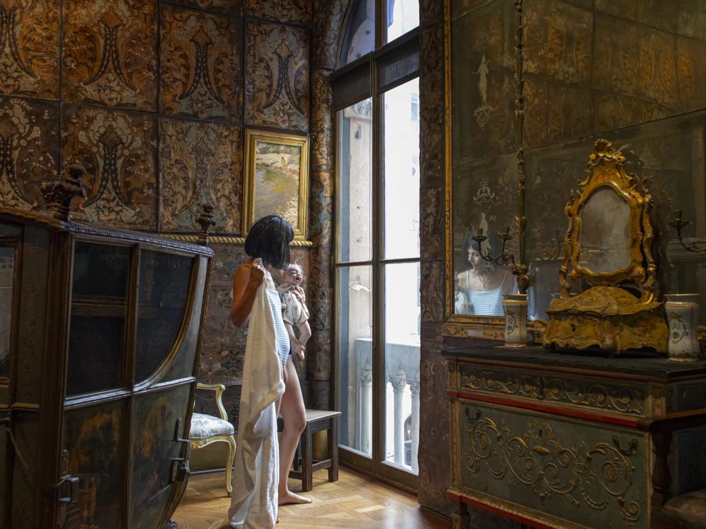 A further development of this work took place during Diamond’s residency at the Isabella Stewart Gardner Museum in Boston during the summer of 2025, where the project entered into dialogue with a collection permeated by Madonna-and-child imagery. The museum itself, suspended between private space and public institution, offered a context in which themes of preservation, identity, and performance converge. The figure of Isabella Stewart Gardner, shaped by personal loss and the careful construction of her public presence, extends this reflection, opening a parallel inquiry into the ways identity is staged and maintained over time.