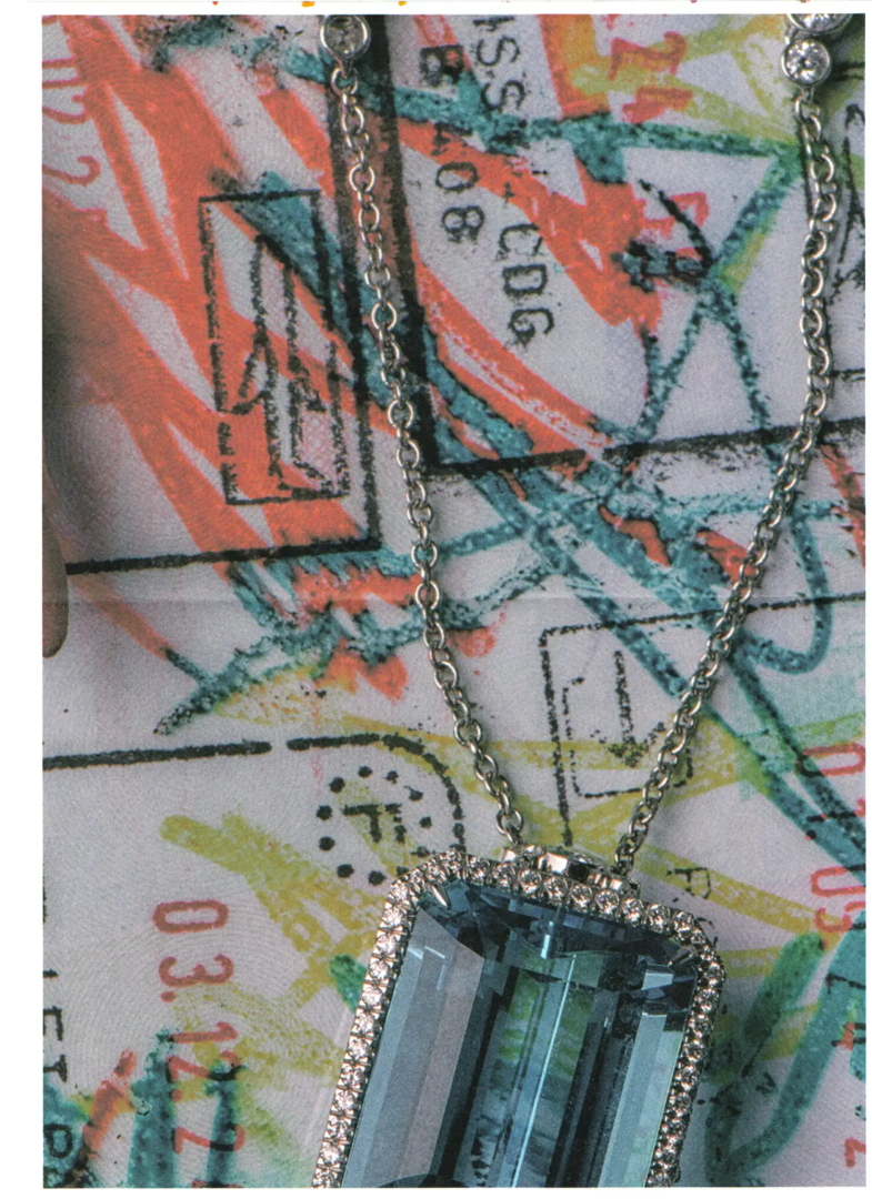Each Soleste jewel features a vibrant center stone encircled by a double halo of diamonds, creating a subtle vibration of brilliance. The collection pays homage to Tiffany’s heritage of gemstone expertise while infusing it with a modern sense of clarity and color. The aquamarine in Bamford’s photograph, framed by an artfully chaotic background of colored markings, becomes almost cinematic.