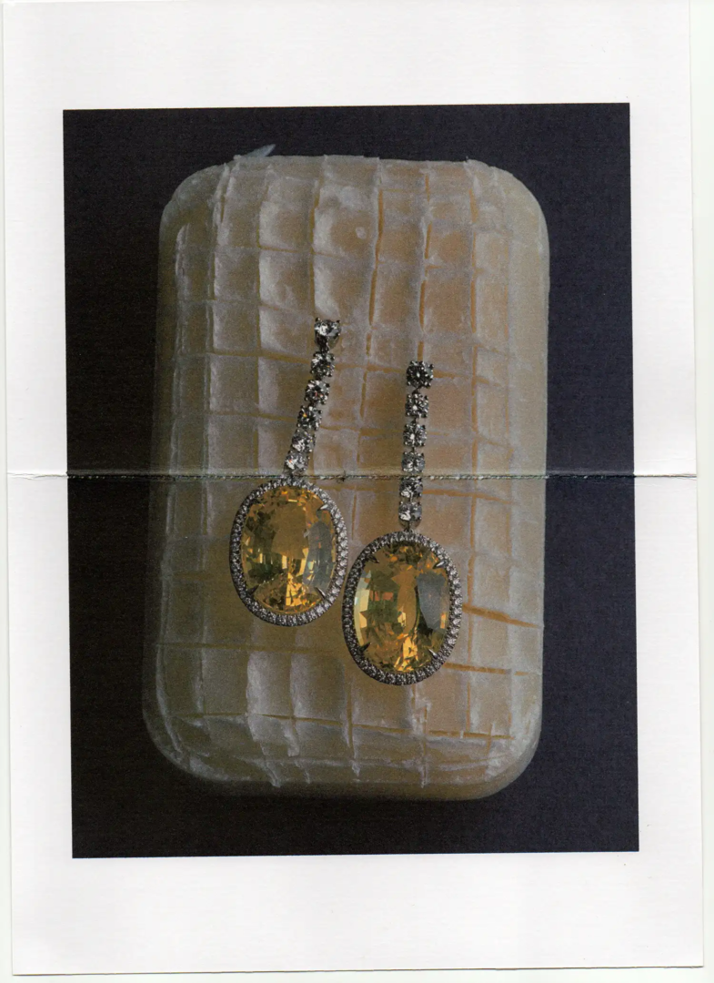 The fringe necklace photographed by Bamford carries this spirit: gold and platinum intertwine like coiled vines, each tip adorned with tsavorites and diamonds — green and white sparks of light. Schlumberger’s genius was in his ability to animate metal, to make it dance. His work at Tiffany became synonymous with audacity and craftsmanship, admired by figures like Jacqueline Kennedy, who famously collected his enamel bracelets.