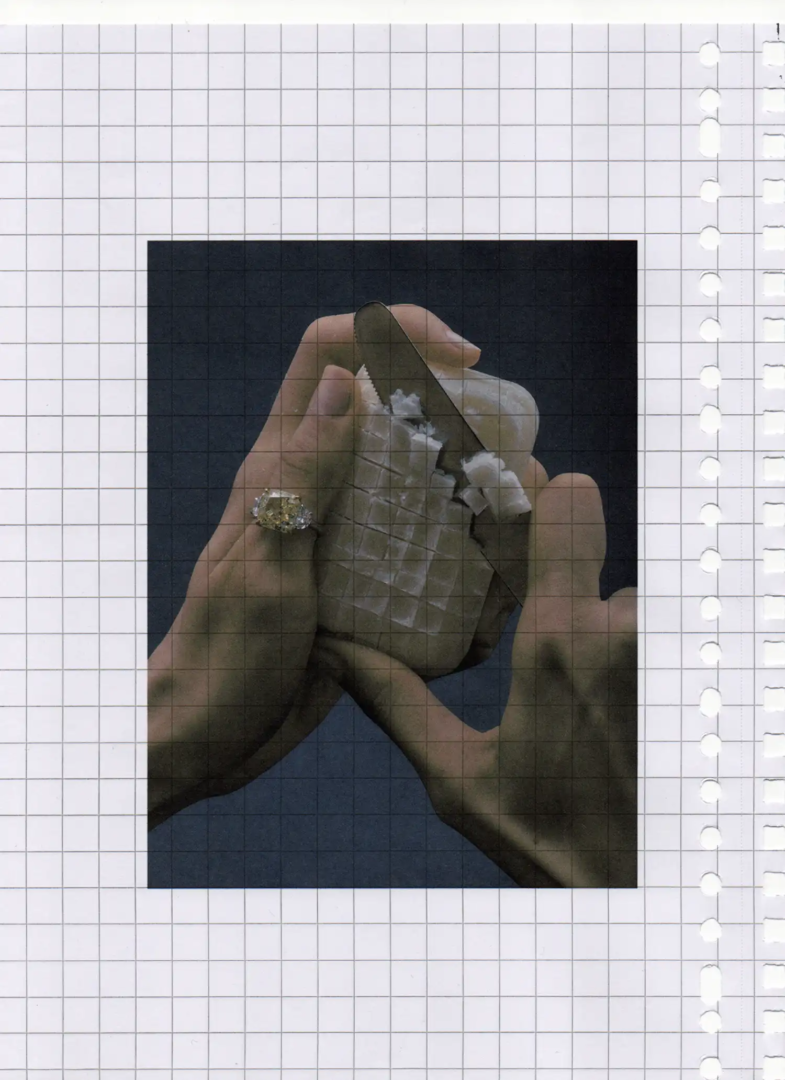 The artist introduces a bar of soap cut into squares. The gesture recalls ASMR rituals found across TikTok and social media: the hypnotic satisfaction of slicing soap, the intimate rhythm of touch, the small pleasures of ordinary life.
