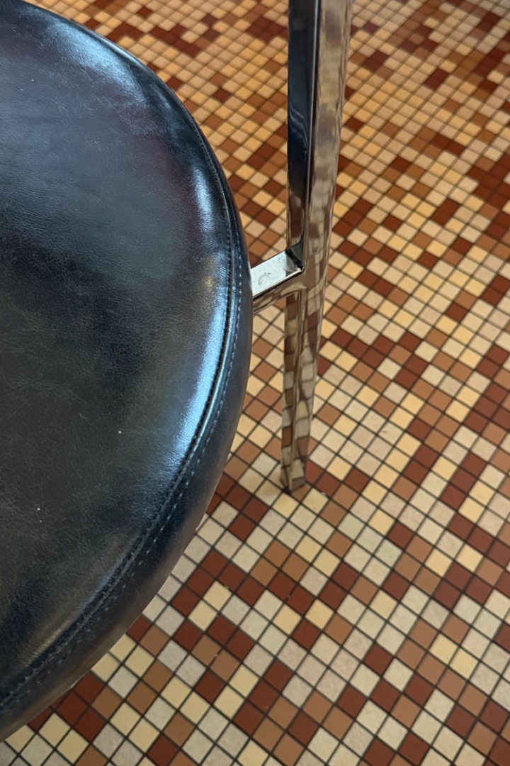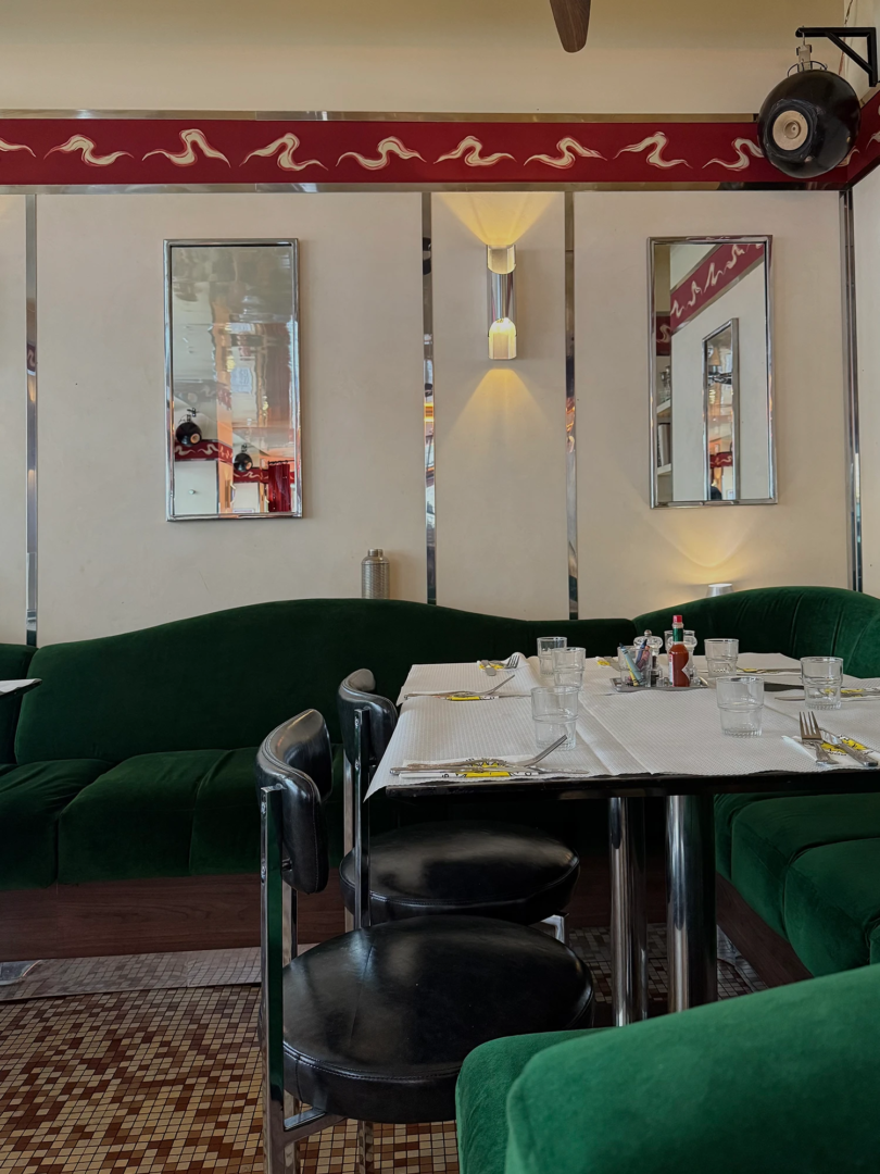 The layout is generous, with banquettes running the length of the walls in deep green velvet. Their curve recalls the intimacy of train compartments and the quiet elegance of Jean Prouvé’s utilitarian forms. The furniture avoids visual excess. Chrome-framed chairs and square wooden tables introduce repetition and rhythm. The wood carries a matte finish, echoing the tactile honesty of Charlotte Perriand’s Alpine interiors and the structure of Pierre Chapo’s joinery.