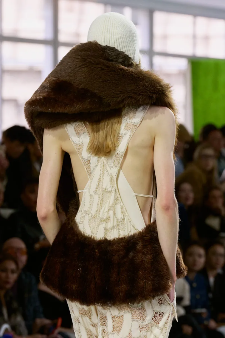Nicolas Ghesquière sent coats and asymmetric dresses constructed to resemble tree bark. Super Nature – a concept that proposes an ancient relationship between the human body and the natural world: garments shaped by wind, rain and instinct, silhouettes born from mountains, forests and plains. Louis Vuitton FW26 opened with a scenography conceived by Jeremy Hindle, the production designer behind the unsettling interiors of Severance.
