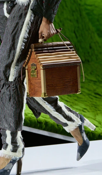Ghesquière’s Louis Vuitton FW26 womenswear collection features coats that are sculptural yet wearable. The details — mineral-effect buttons, heels referencing deer antlers, flowers moulded in leather — reinforce the narrative of the Super Nature runway. Accessories remain central to the Louis Vuitton fashion ecosystem: the iconic Noé bag, originally introduced in 1932, reappears in its historical proportions and colourway.