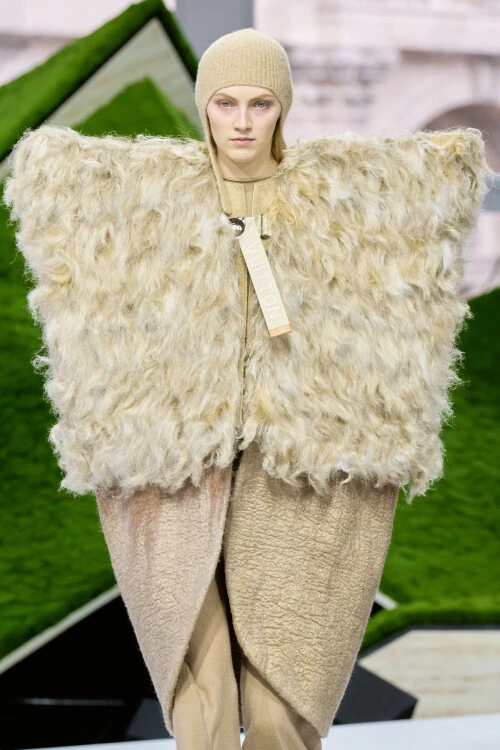 Louis Vuitton FW26 opened with a scenography conceived by Jeremy Hindle, the production designer behind the unsettling interiors of Severance. Nicolas Ghesquière sent voluminous coats and asymmetric dresses constructed to resemble tree bark down the runway. The Louis Vuitton Fall Winter 2026 womenswear collection is titled Super Nature, a concept that proposes an ancient relationship between the human body and the natural world: garments shaped by wind, rain and instinct, silhouettes born from mountains, forests and plains.