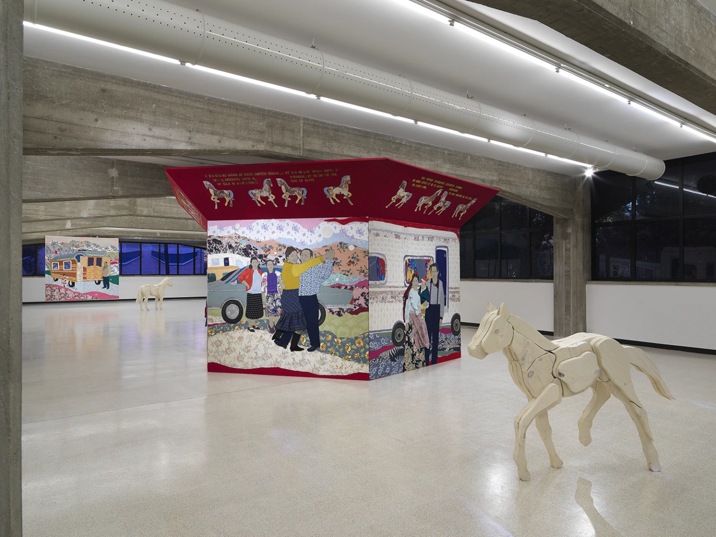 The Big Dipper Will Foretell the Future of the Roma non è una mostra sull’alterità romantica dei popoli nomadi, ma un atto politico travestito da festa: un patchwork di stoffe e memorie che tiene insieme generazioni e traumi collettivi. Il carro, nella cultura rom, non è solo un mezzo di trasporto ma una promessa, un simbolo di cambiamento. «Rappresenta la speranza», spiega l’artista. «Nella nostra cultura la vita è come una ruota: può sempre girare verso il bene. L’augurio è che tutte le famiglie rom e sinti possano vivere una vita libera da pregiudizi e discriminazioni».