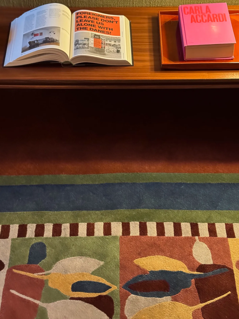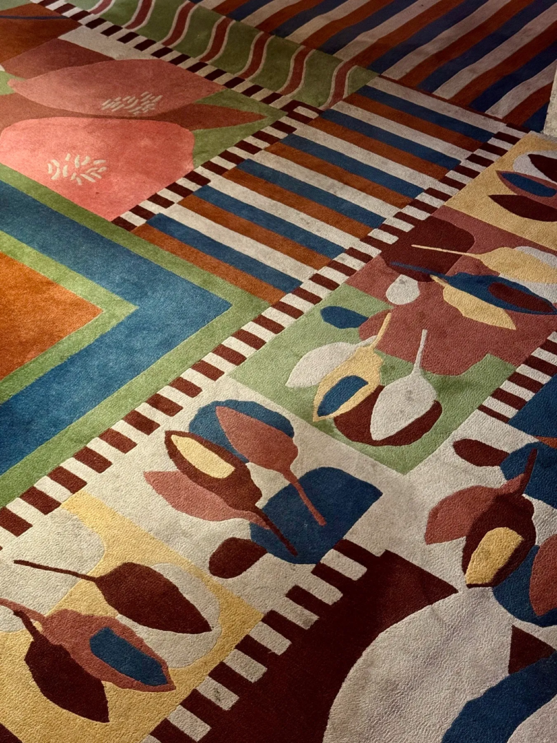 Irish artist Nigel Peake designed a floor covering for the studio – a flowing textile path featuring abstracted botanical motifs in saturated colors. This carpet-tapestry guides visitors through corridors like a narrative thread connecting disparate spaces.