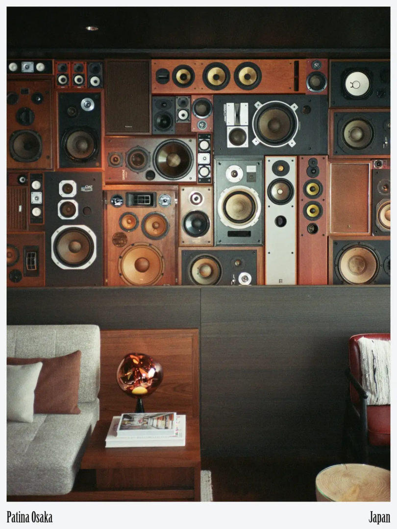Patina Osaka uses sound as a medium to explore human diversity – bridging subcultures, generations and auditory traditions. A wall of historic loudspeakers, assembled by Intercultural Art, houses a curated vinyl collection selected by a Shinsaibashi-based record specialist active since 2000. His selection spans jazz, city pop, R&B and rock from the 1960s to the 1990s, focusing exclusively on analog-era recordings. These decades represent a shared sonic archive in Osaka: neighborhood record shops, small live houses and local broadcasting shaped communal listening habits that continue to influence the city’s identity.