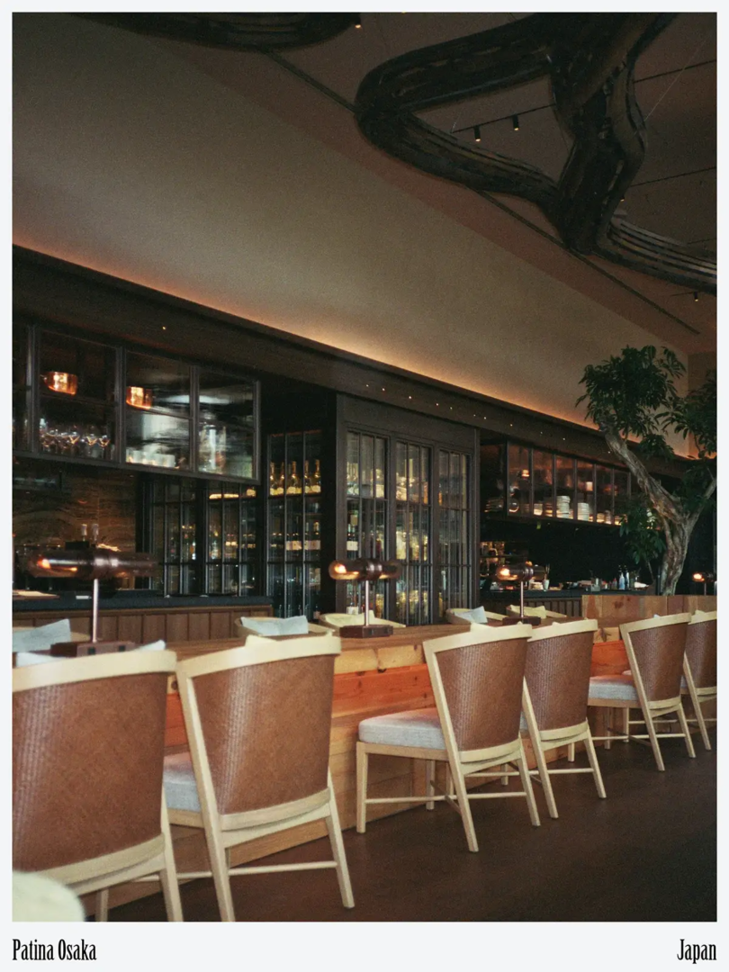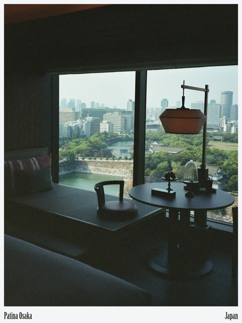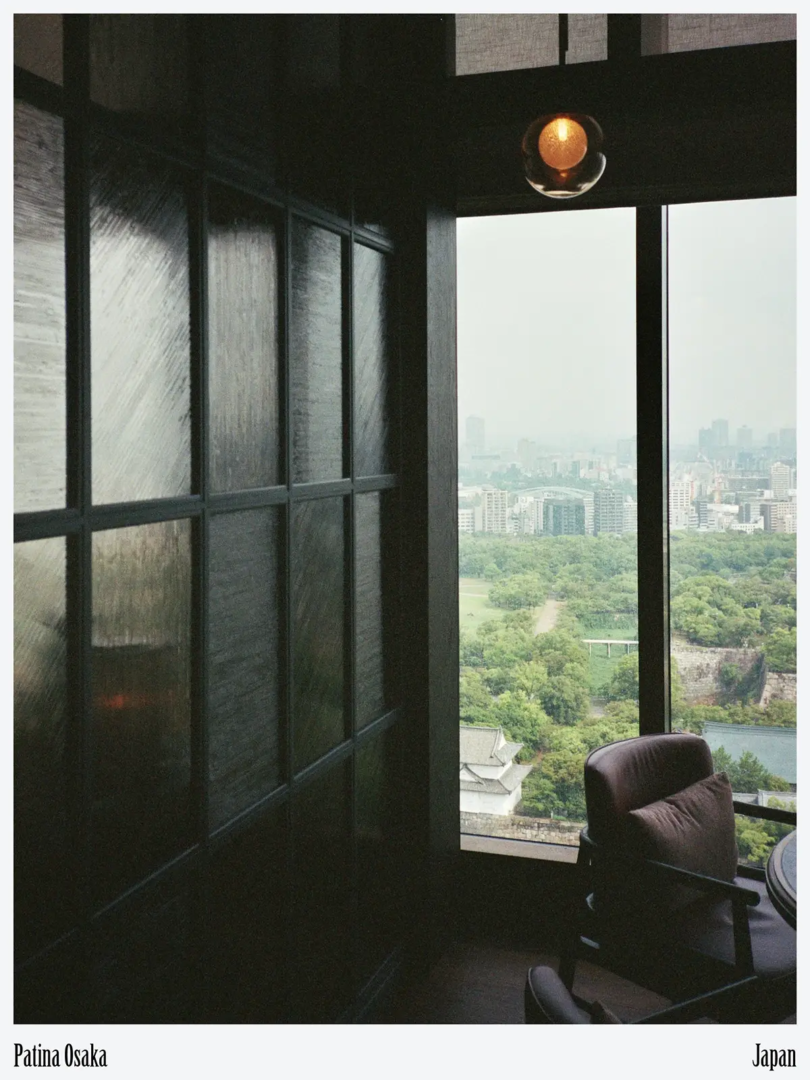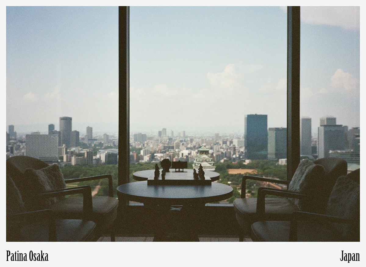 Overlooking Osaka Castle Park, at Patina Osaka Hotel stone-and-timber architecture and an OJAS analog listening room – the city’s craft heritage and contemporary cultural identity