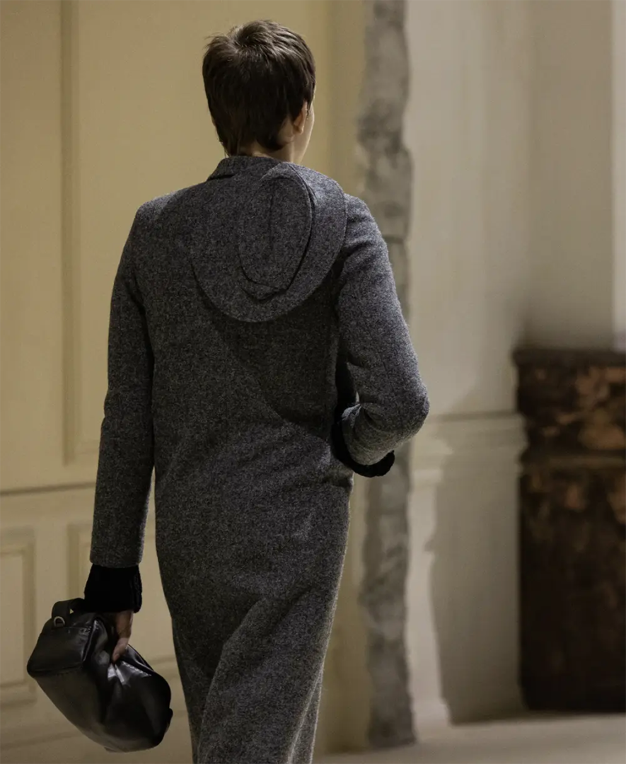 Percepiamo la misura con cui iniziavo queste righe: non è una questione di un ragazzo efebico, non è neanche una questione politica e polemica sulla differenza di genere in questa epoca avvilita da cancel culture. Si tratta di disegnare un cappotto che stia bene addosso – sia a un uomo sia a una donna – nelle taglie corrette. Ancora: l’immaginario è quello attuale, la misura è quella che riconosciamo: un ragazzo per bene che se ti cammina a fianco ti volti a guardare perché vorresti vestirti come lui. Poi arriva lo styling – i polsini della camicia che escono in abbondanza dalla manica del cappotto sartoriale, con dei gemelli grossi, smaltati, che potrebbero essere orecchini.
