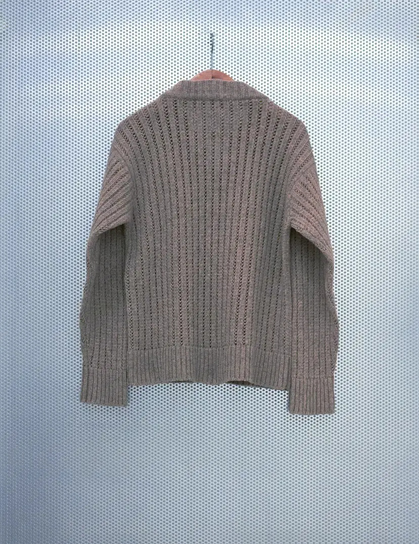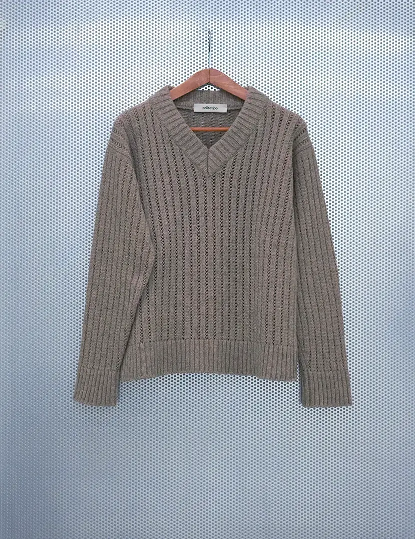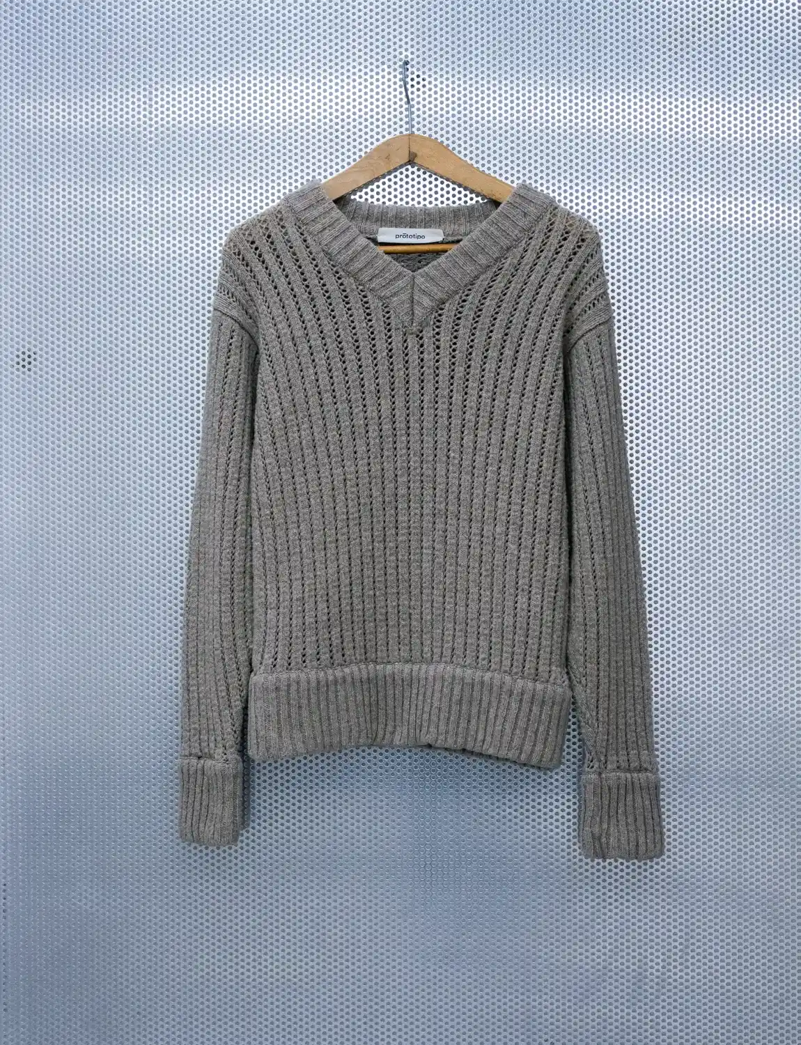 This V-neck pullover features a 4.2 rib edging that accentuates the deep neckline. Its relaxed fit offers comfort, with no elastic fibers, allowing the garment to drape effortlessly. The slightly flared waist adds to the genderless and seasonless nature of the design. Perfect for year-round wear.