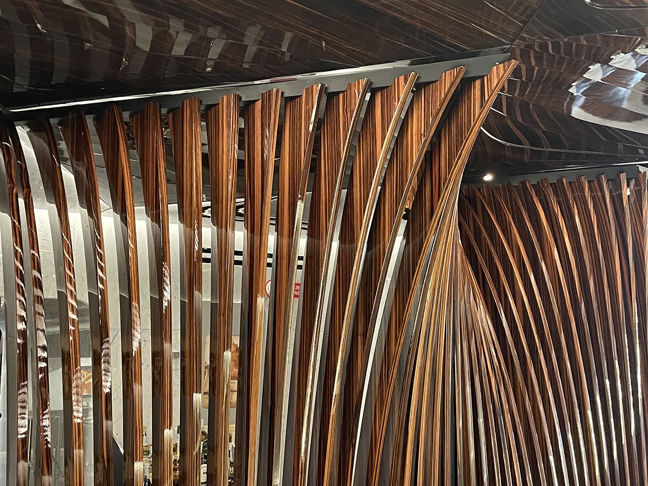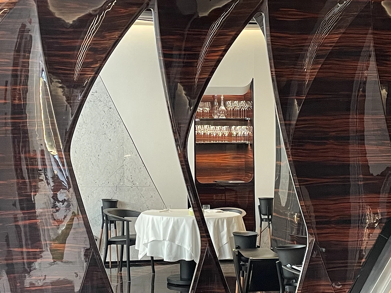 Hadid’s architectural statement at Romeo Roma extends to the materials. Her studio developed an inventory of surfaces that combine performance, sustainability, and formal intent. Ebony Macassar defines thresholds and intimate spaces, its dense grain pattern and dark hue absorbing ambient light to create tactile quietness.