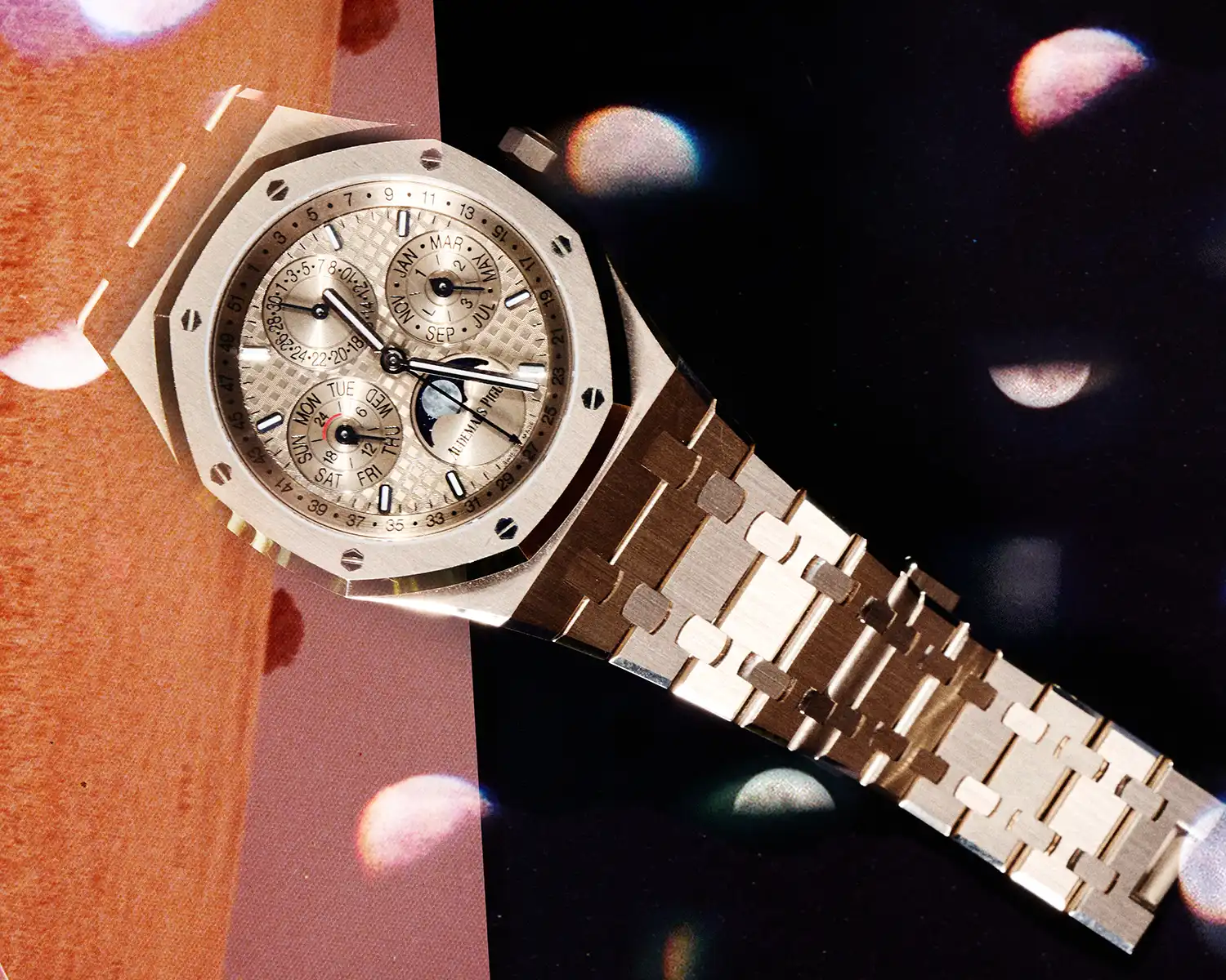 This version of the Royal Oak introduces a proprietary 18-carat alloy called Sand Gold, whose tone shifts between pink and white depending on the light. The 41 mm case and “Grande Tapisserie” dial integrate the perpetual calendar functions — day, date, month, leap year and moon phase — in a balanced and legible layout. Despite the mechanical complexity, the watch retains the clarity and proportions typical of the Royal Oak line.