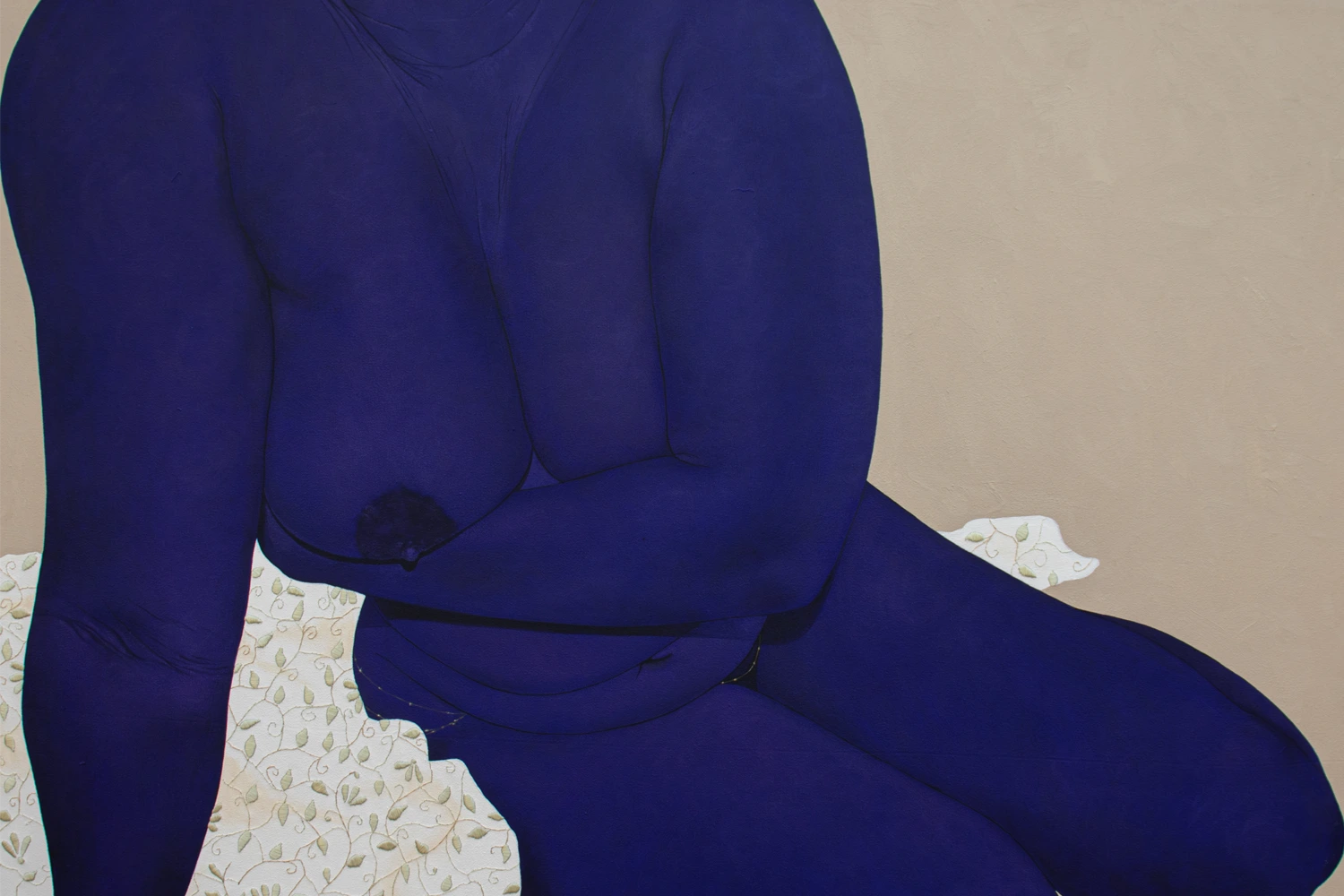 Stacey Gillian Abe uses the deep, emotive hue of indigo to construct her figures: “Indigo allows the observer to initially perceive Black subjects in a different way. The use of indigo in my work emphasizes these pasts while redefining our present and future narratives surrounding the Black body. Beneath all of that, indigo is a color that has played a key part in placing the Black body in the past that has permeated into our present.”