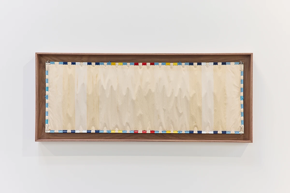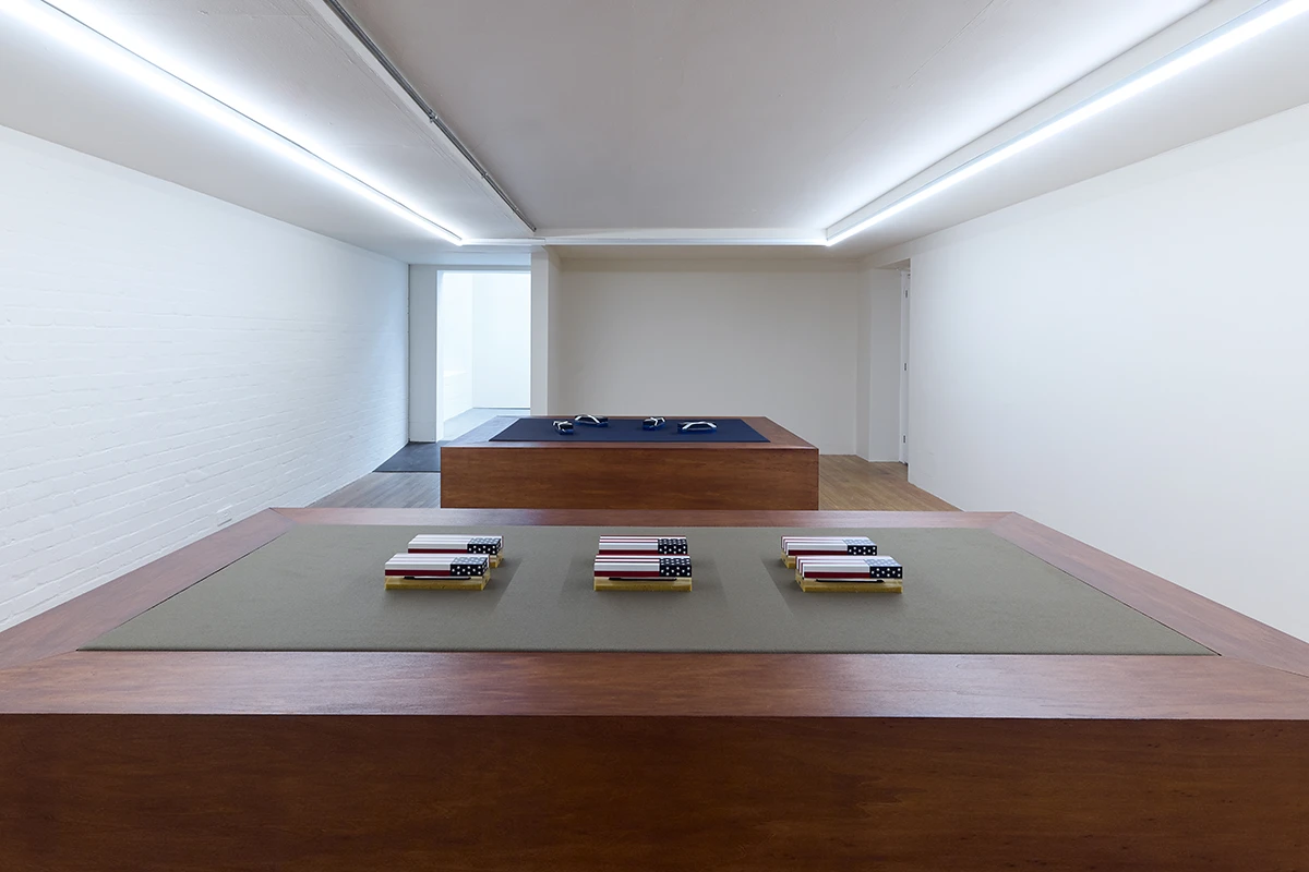 In ‘Shell (I)’ and ‘Shell (II)’, Sasraku crafts her own memorabilia: a series of acrylic, coffin-shaped paperweights adorned with American flags over broken pens and sandy terrains. On the walls are rippling paper works, onto which Sasraku has rendered scaled-up and distorted symbols like the Global War on Terrorism Medal. UV-printing means these pieces are designed to fade over time.