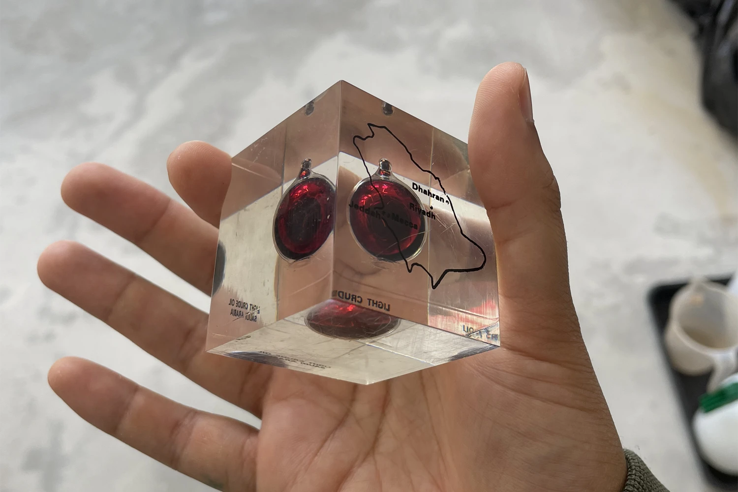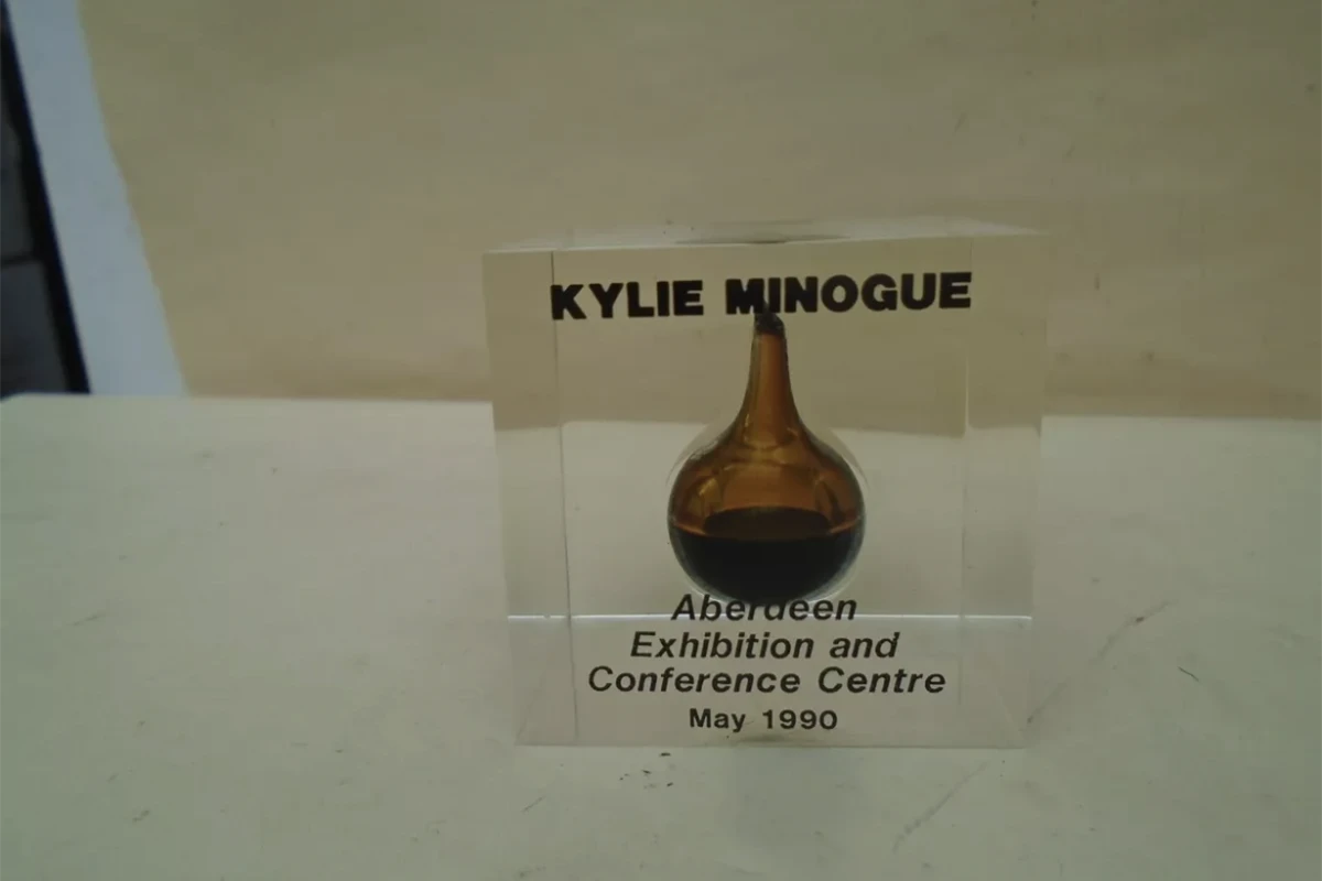 Companies like Derrick in the United States, BP in the UK, and the Gulf Oil Corporation in Zaire produced paperweights housing small amounts of crude oil, often accompanied by golden rigs, souvenir coins, and engravings marking new ventures. At the time, they were found on mantlepieces, in homes, and on the desks of oil tycoons. Now, they mostly surface on online marketplaces like eBay.