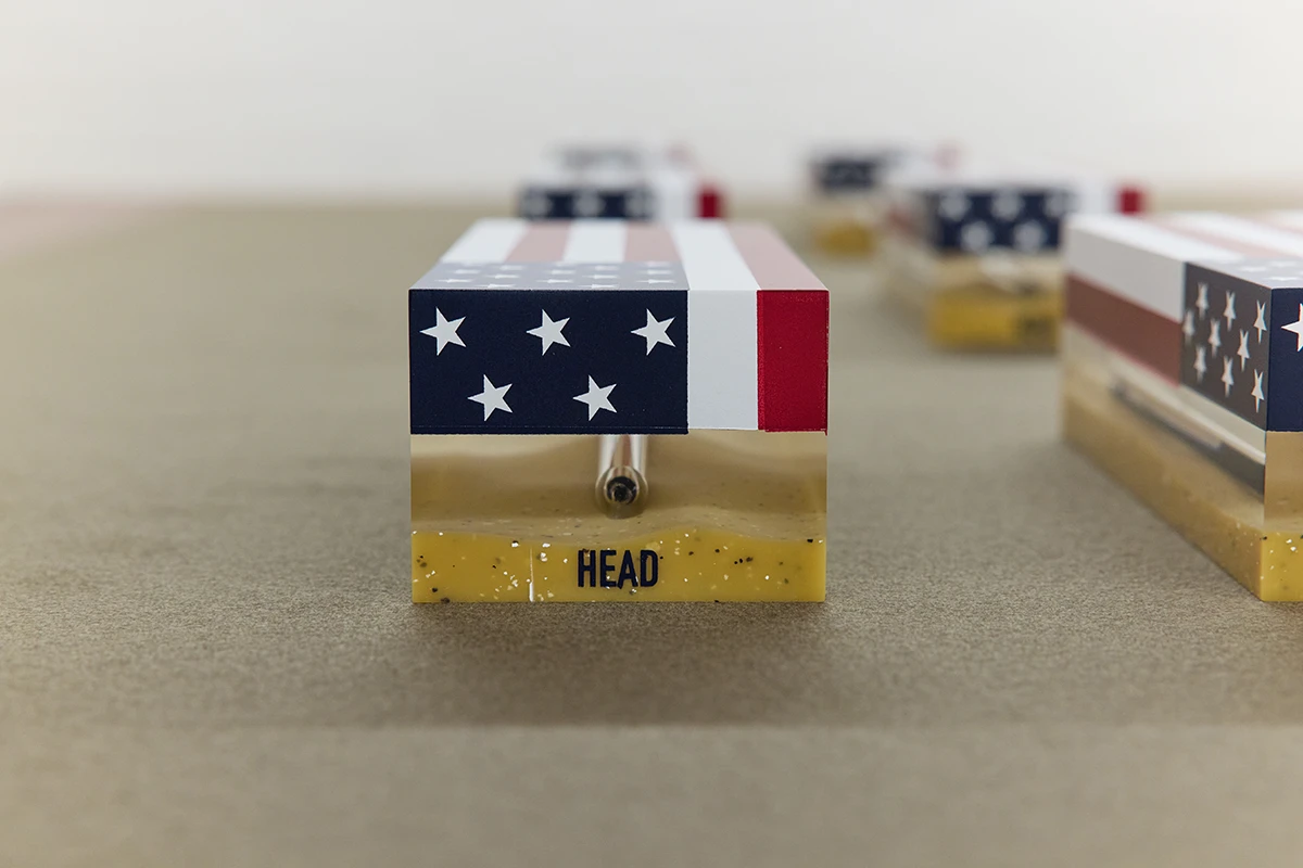 JB. You’ve also made coffin-shaped paperweights encasing broken pens. Some are adorned with the American flag. How do these play into the story?