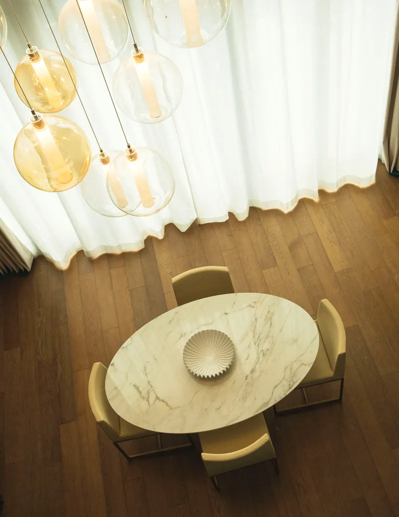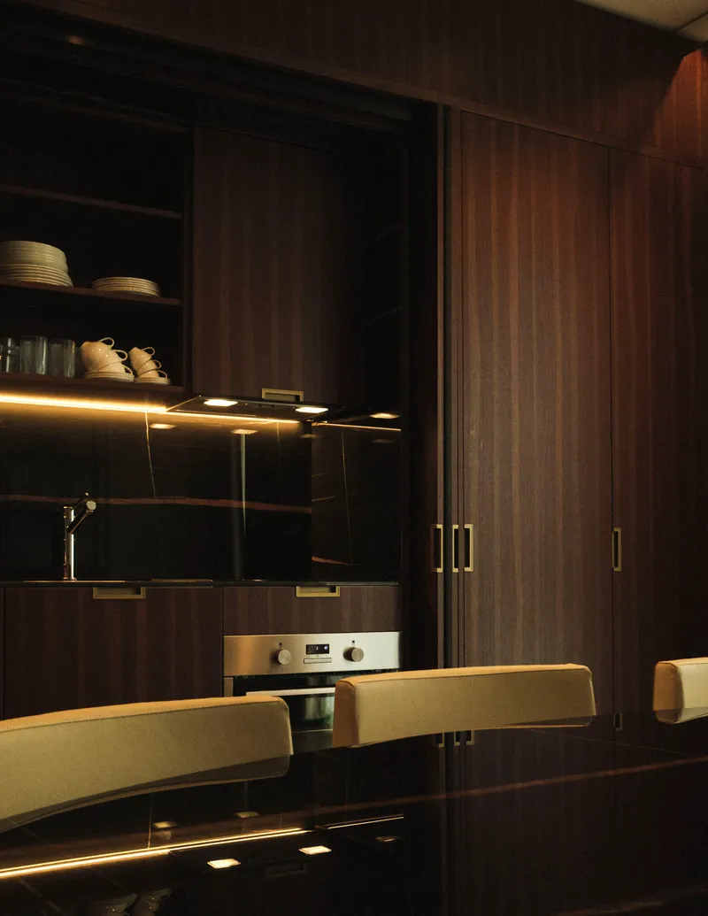 Some units include steam showers. Other design solutions address everyday use: retractable kitchens, pivoting panels that conceal television screens, and surfaces designed to limit visual clutter. Order is approached as a practical requirement before an aesthetic one.