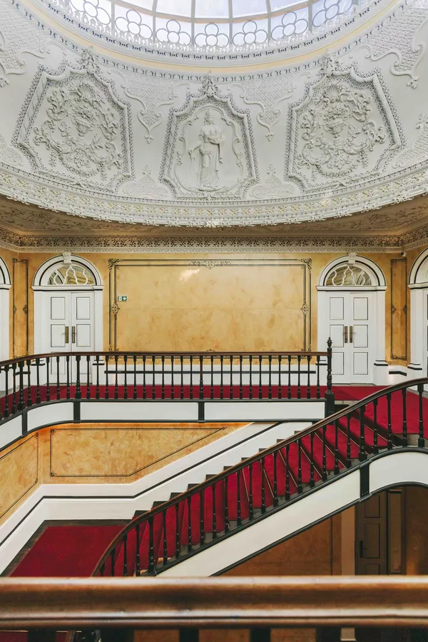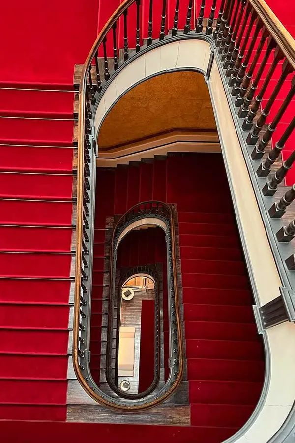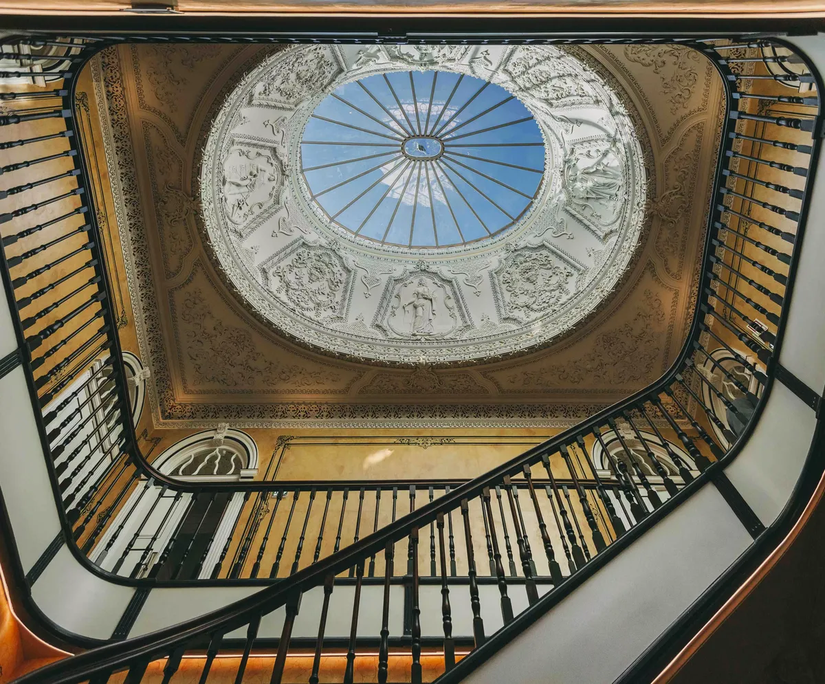 The architectural structure was preserved, while the renovation focused on furniture, colours and lighting. The goal was to highlight the palace’s beauty — from the lobby and staircase to the skylight. The curved staircase leads the eye to a domed ceiling adorned with bas-reliefs of four deities dear to the merchant family who once owned the palace. At night, subtle lighting enhances the dome’s contours, creating an atmosphere of quiet grandeur.