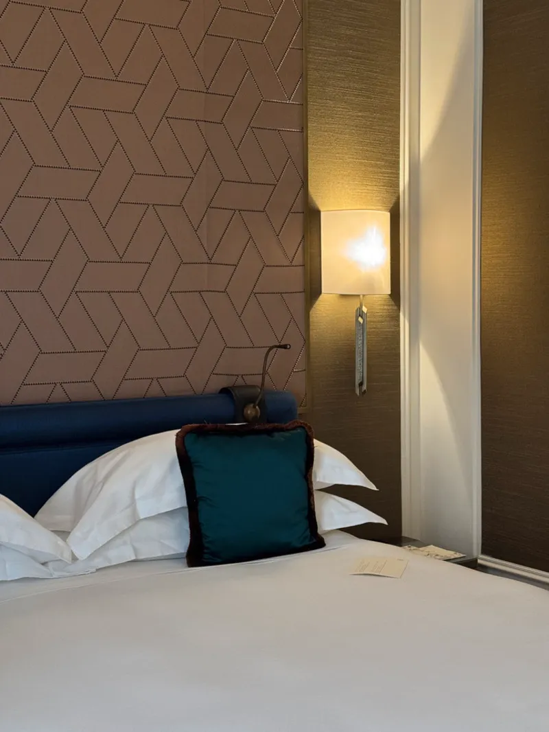 The interior material palette is concise. Marble, wood and textiles constitute the core surfaces. These raw materials preserve the tactile presence of the space. Marble in bathrooms retains natural veining and tonal differences. Wooden panels absorb sound and introduce warmth into the suite layouts. Textiles come from Italian manufacturers with longstanding artisanal practice. Surfaces emphasize precision rather than ornament.